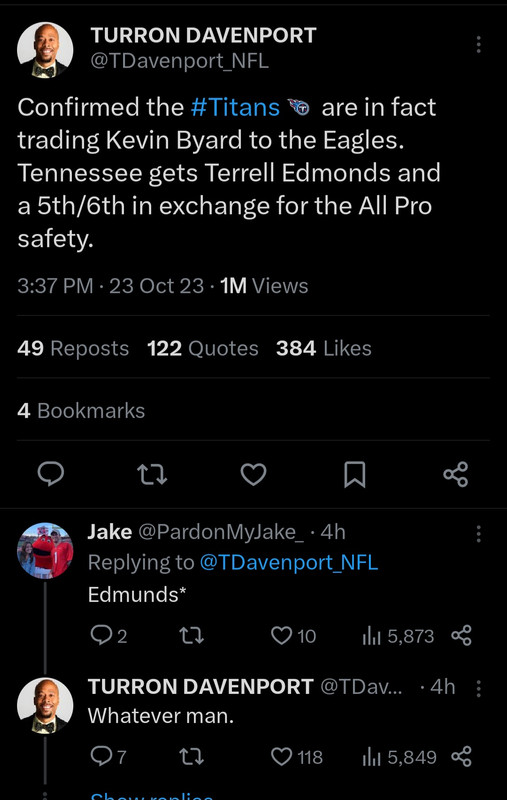 I am now cheering for Terrel EdmUnds. Howevah, it seems that DB Elijah Molden will fill Byard’s spot. I’ve seen Molden in many highlights–highlights for the team playing TEN, I mean. But surely Molden was in the right place and it was the other guy who missed an assignment. Plus I’m sure TEN’s coaching staff spent the Week 7 bye making adjustments mutter mutter mutter…