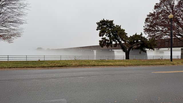 This is The Long Bridge, a railroad bridge across the Potomac River at Washington DC. It was built in 1909, replacing a previous bridge. It was for decades the interface between the Pennsylvania Railroad (north) and the Southern Railroad (south). It is still heavily used and owned by CSX. I don’t think it has ever been repainted since it was built. This photo was today in the beautiful fog.