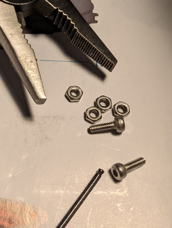 Those are M2x6 screws that mate to M2 nuts. This requires both a 1.5MM driver, and something to hold the M2 nut. Normally not an issue (for me, I’m built differently), but you can see that the screw top is directly below the above surface which means a 1.5MM screwdriver can’t get in there. And my 1.5MM allen key has a short side that is still too long to fit in that gap. So, that means I have to use the wobble end on the long side of the allen key. This very much means I cannot get a reliable hold on the screw head and very much increases the likely hood of striping the screw head. On the other end, there’s no 1.5MM socket to hold the nut. So instead, I’m using a small pair of pliers. Unfortunately those nuts are less than .5MM thick, so they twist wildly when trying to mate with the screw. This precision is, again, very difficult while drinking. Worse, these tiny screws and nuts like to fly about when squeezed too hard, and then they are incredibly difficult to locate.
