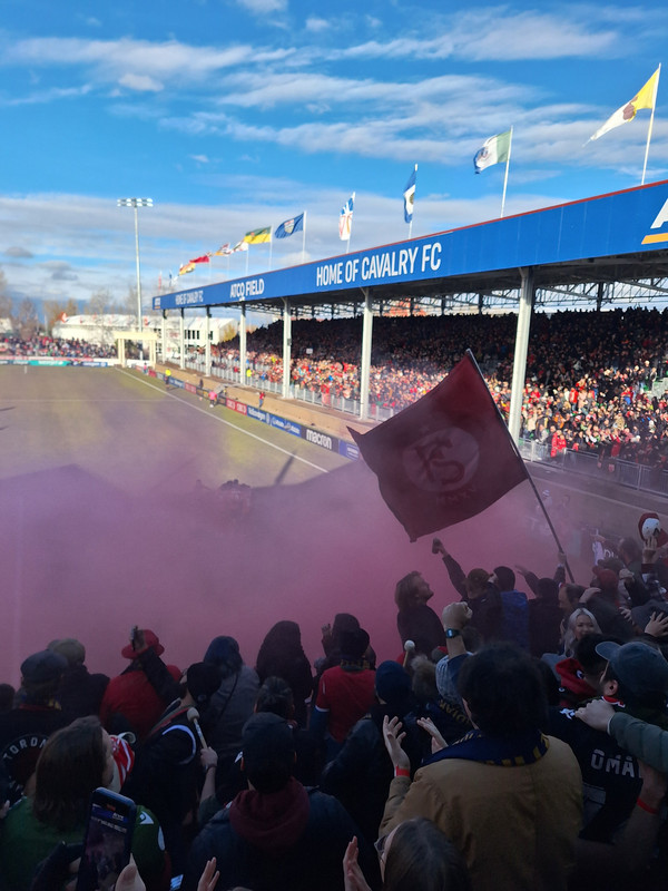 Three day bender post Cavalry FC win has finished and I have caught a cold due to abusing my body. What a weekend. Deci walked out with the team, I was on the pitch holding the banner. Got to drink out of the cup with my buddy who plays for the team who also took off his warmup kit and gave it to me for Deci.