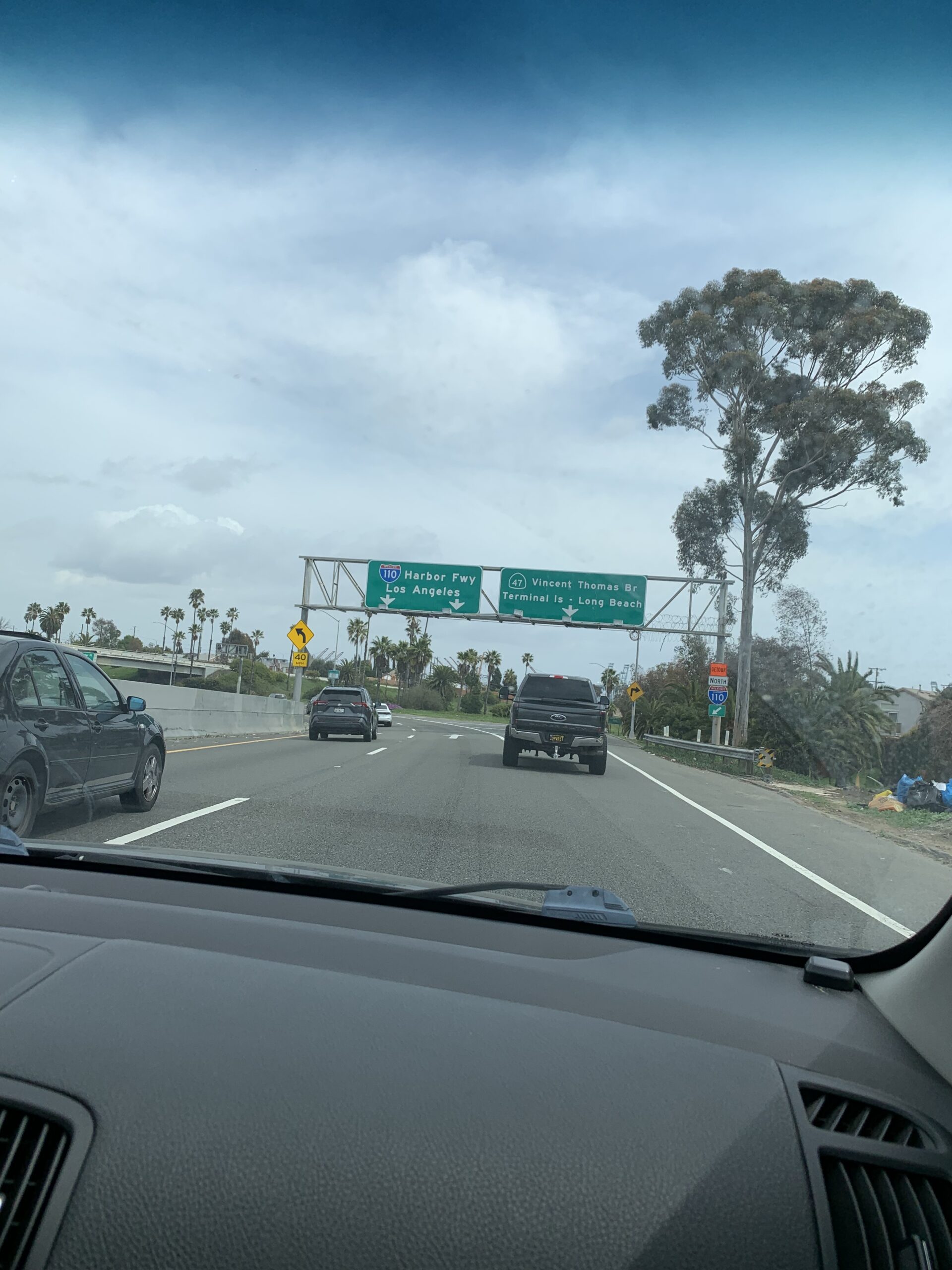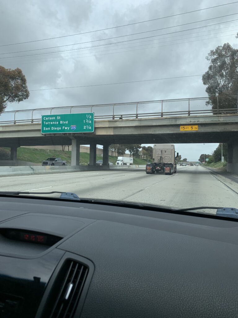 Or more appropriately the “Lack” of traffic volume. This stretch of the 110 is usually user friendly and more of a locals only type stretch. Except for the goddamn trucks. Since we’re right on the Port of LA and across the harbor from the Port of Long Beach, every fucking truck on the planet takes this stretch. California has a traffic law where big rigs are supposed to stay in the 2 right lanes leaving the 3 and 4 lanes for regular traffic.