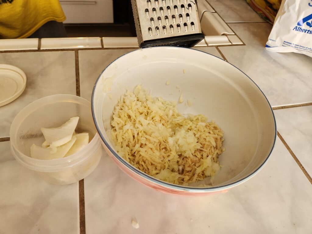 Grate the onion. You can alternate onion, potato for a better mixing of flavors if you like.