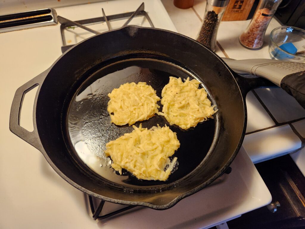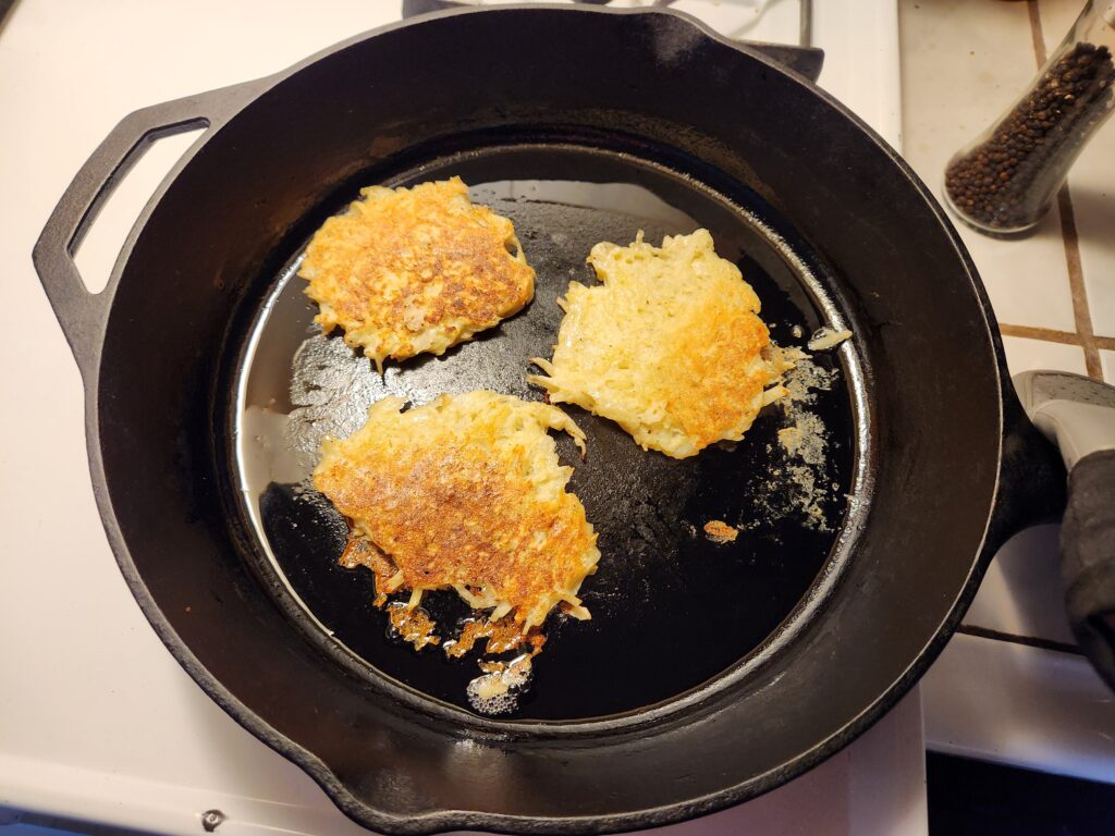 Spoon into a lightly greased and smokin’ hot cast iron skillet.