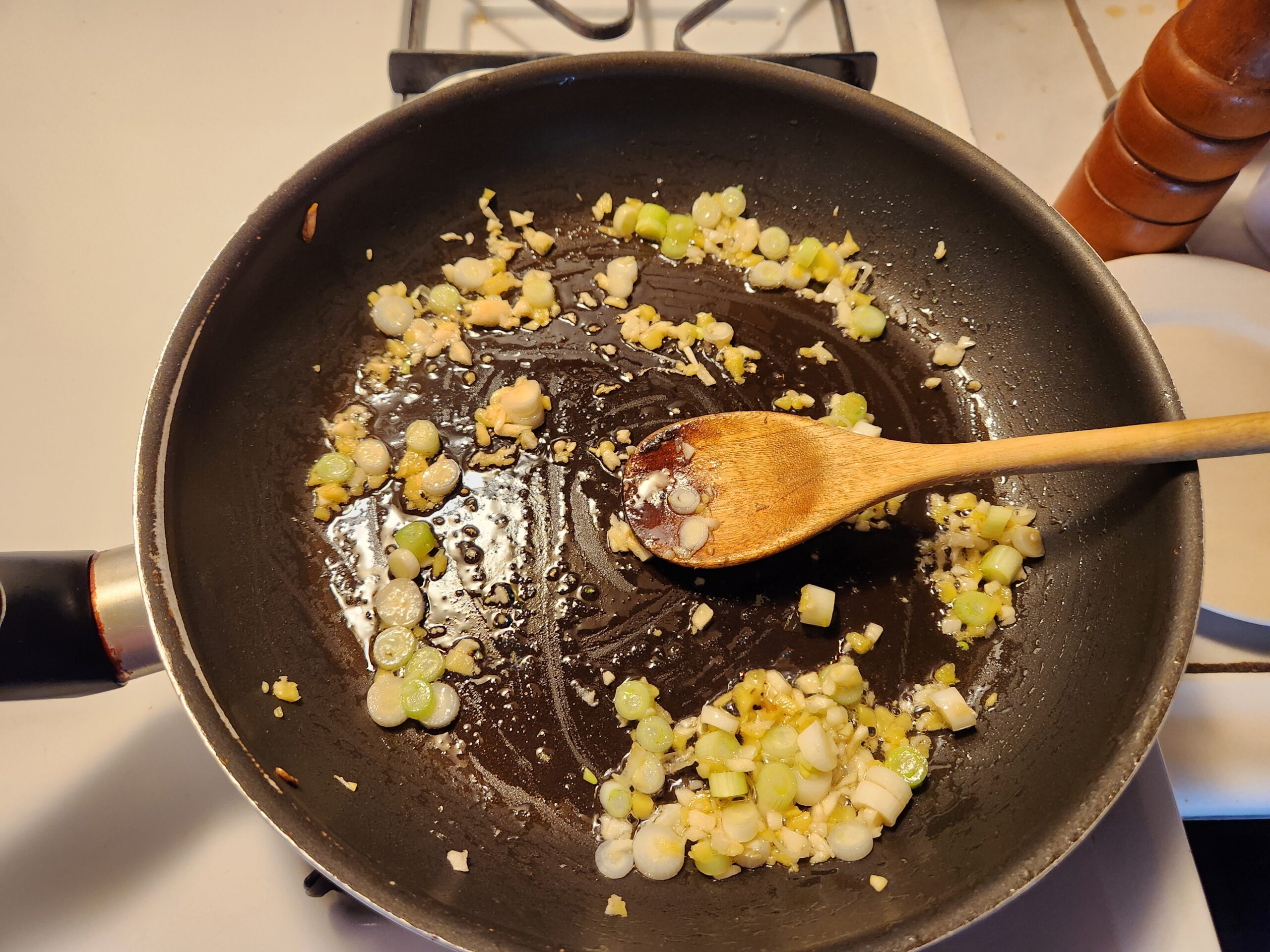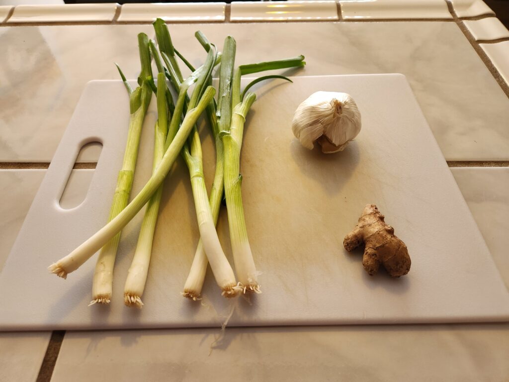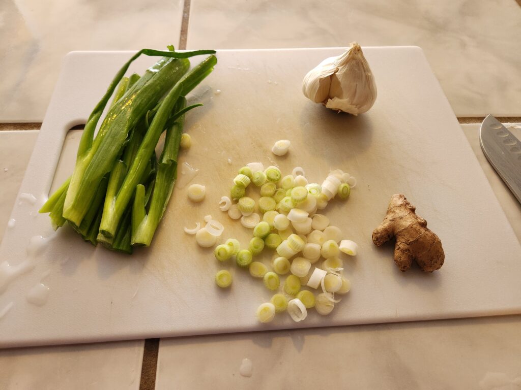 Nope. Can’t do it. For me the base to any Chinese food recipe has to have green onion, garlic and ginger. That’s on me but I’m standing by my motherfucking principles on that. I’ll use about 1 tablespoon or so of the minced ginger, 4-5 cloves of minced garlic and the white parts of the scallions seen here.