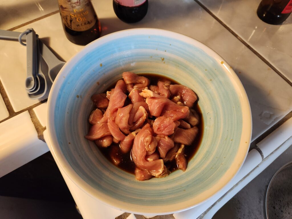 If you were paying close attention to the photos up there you may have noticed some sesame oil next to that rice wine. Good eye. I used a little splash of that in the marinade as well.