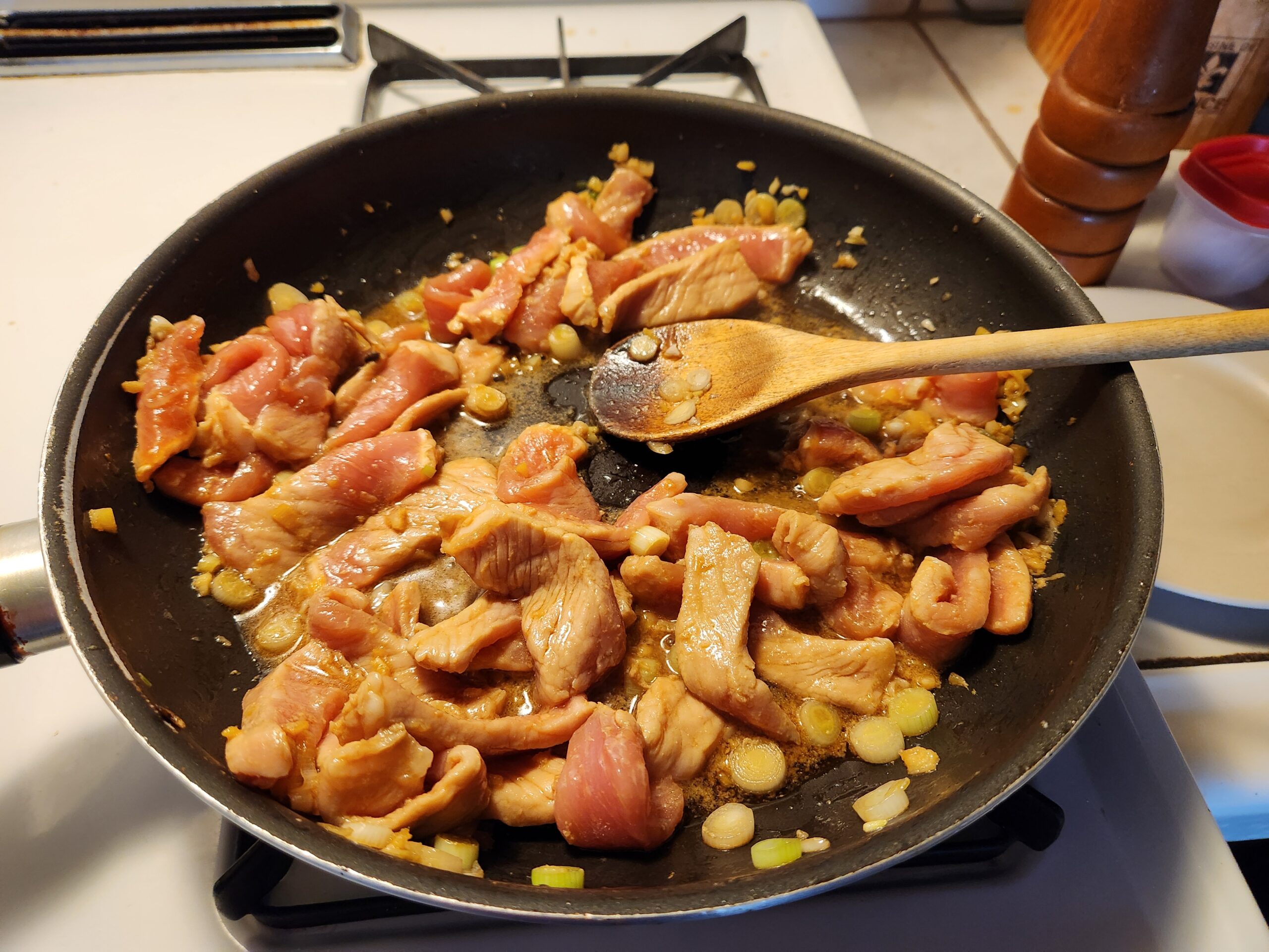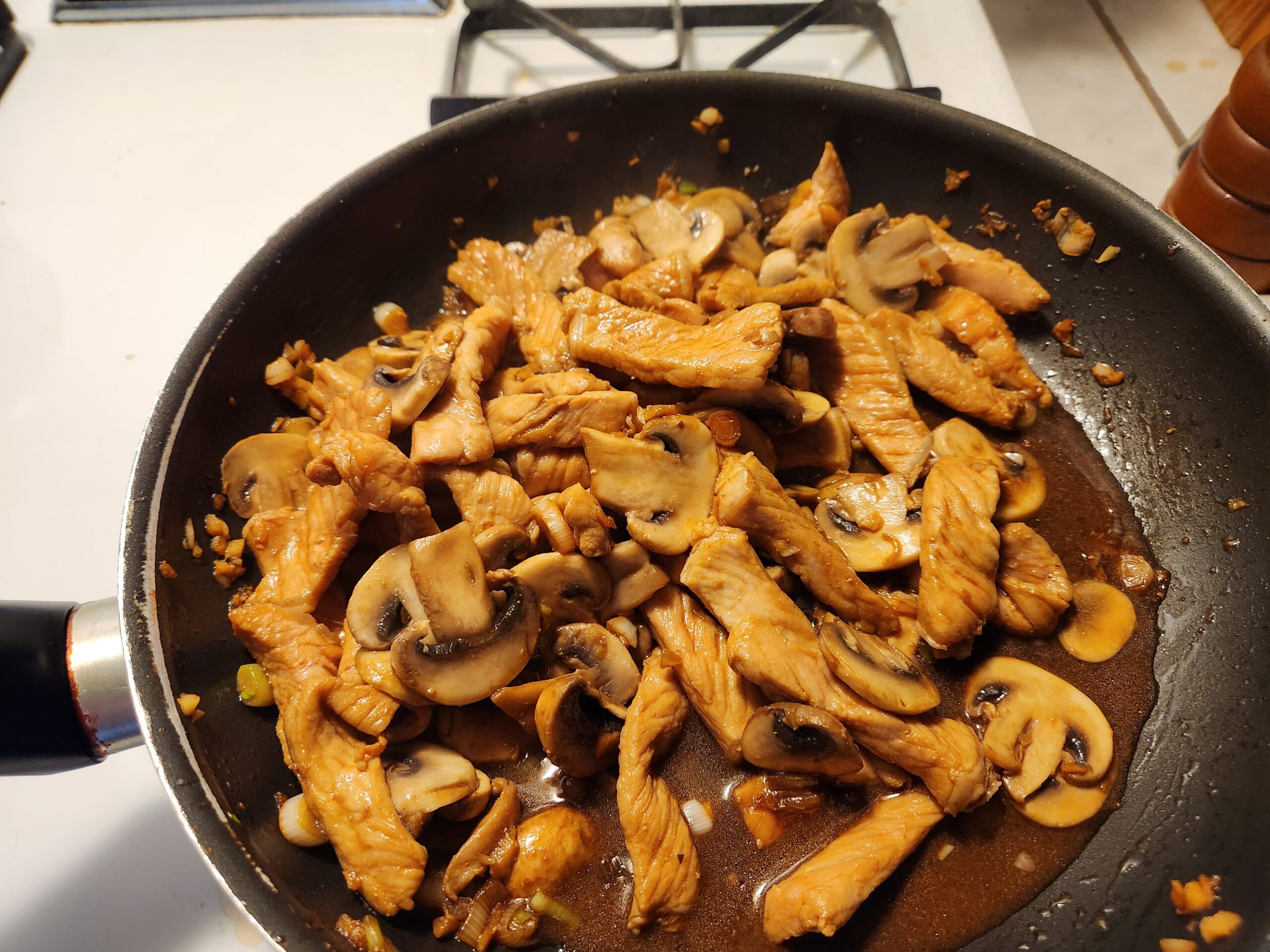 I took the liberty to substitute the shaoxing rice wine since I already had it on hand and I’m willing to guess that this was the real ingredient in the original recipe concept. The author probably figured most American cooks had sherry in their kitchen. EVERY goddamn one of them I’m willing to bet back in 1945.