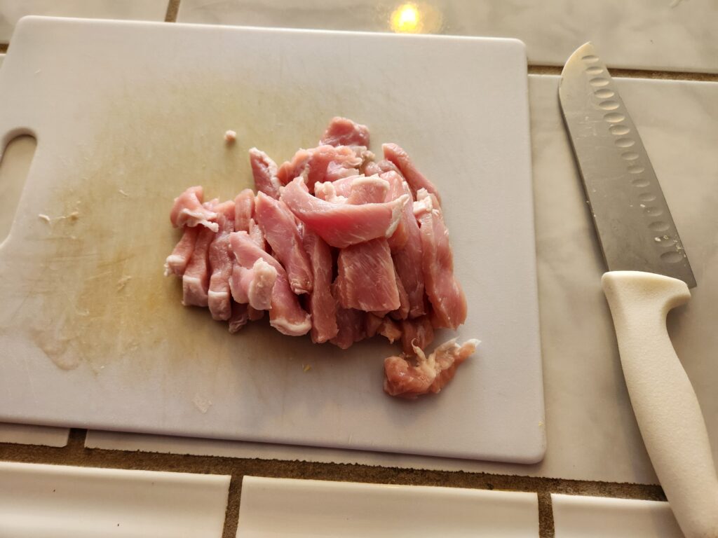 Quoting from the recipe “Slice meat into flimsy slices about 1 inch square and 1/16 inch thick, or thicker if you can’t. This needs a lot of patience and skill, but most Chinese wives have them.”
