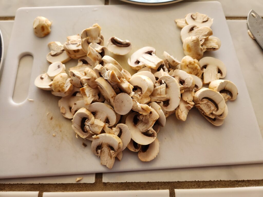 Once again from the recipe: “Wash and slice mushrooms so that the pieces look like ꟼ I I P from one side and like T T T T from another side.”