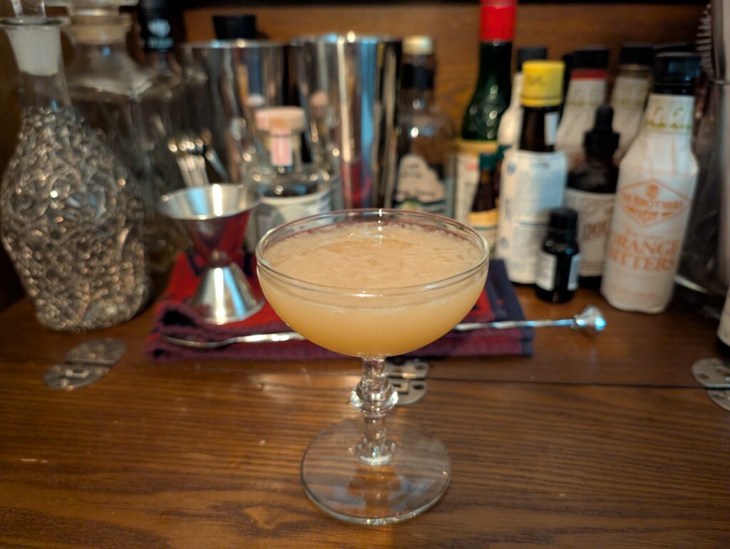 Of which, I think bourbon might be too soft here. I get wanting to hold back on too much whiskey flavor, but so far, I think bourbon can’t stand up here, which is rather surprising if you ask me. It’s not like whiskey isn’t a subtle liquor to add to a drink. I’d be curious to see what a second ounce of rye does to the saccharine flavor lead this drink has. The finish is about the same as when the lemon kicks in. A citrus-y nutty sweet mix of flavors, which I think is improving as I sip it? Or it could be the whiskey talking here.