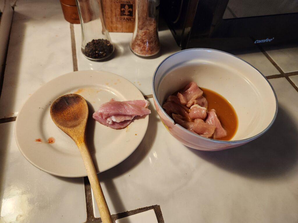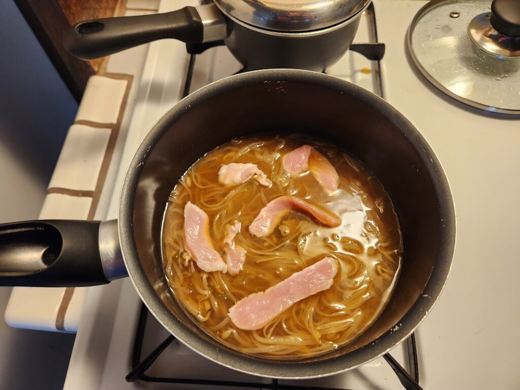 The third way we’re going to cook the pork is by dropping a few raw slices into this here.