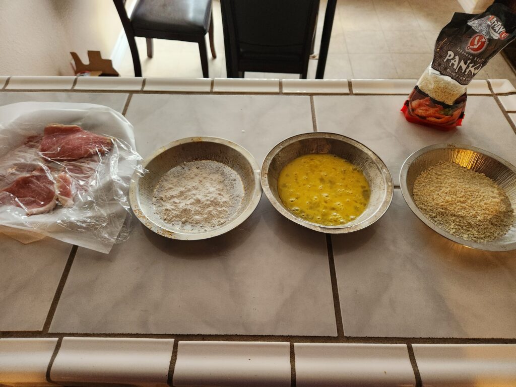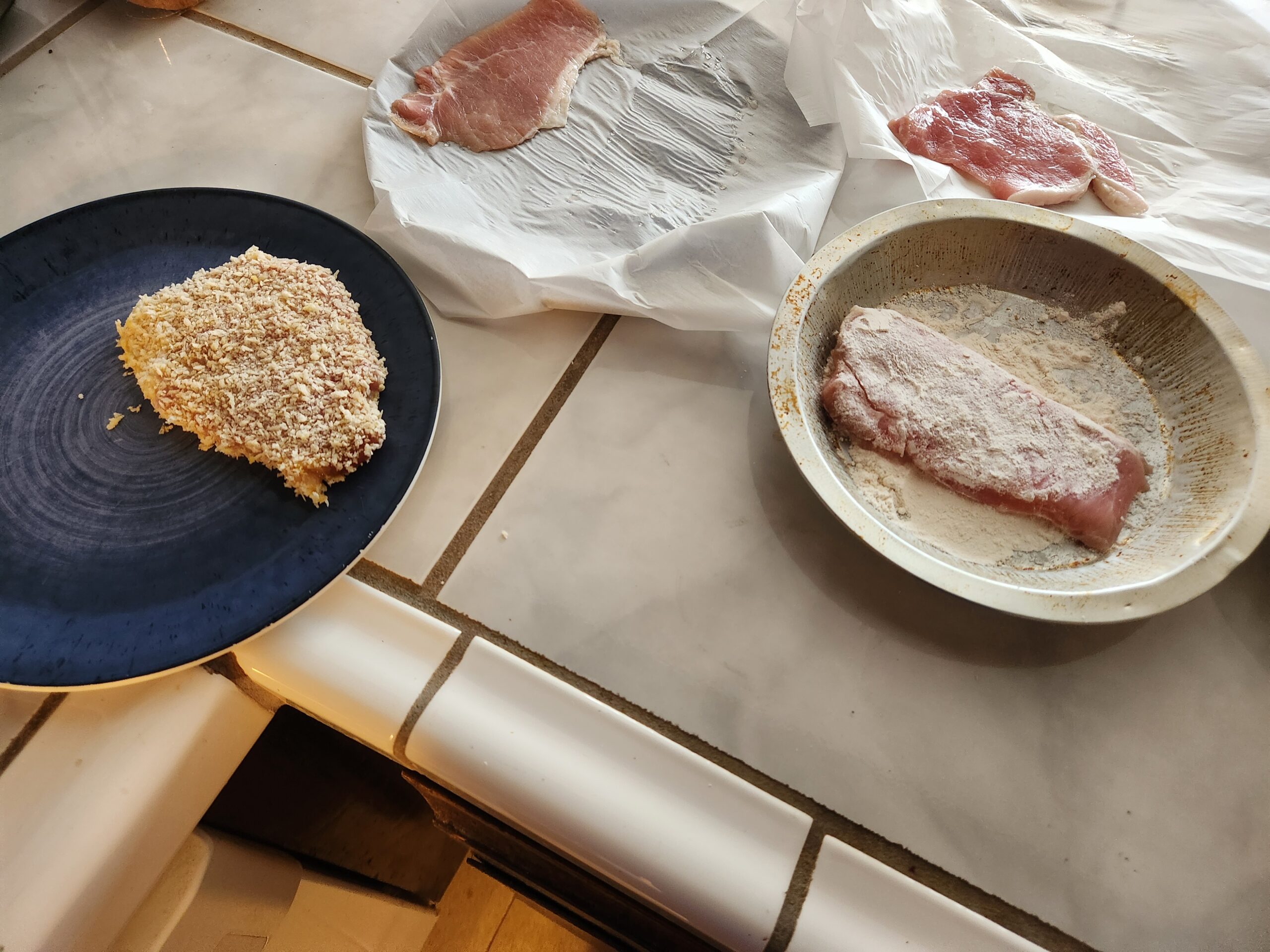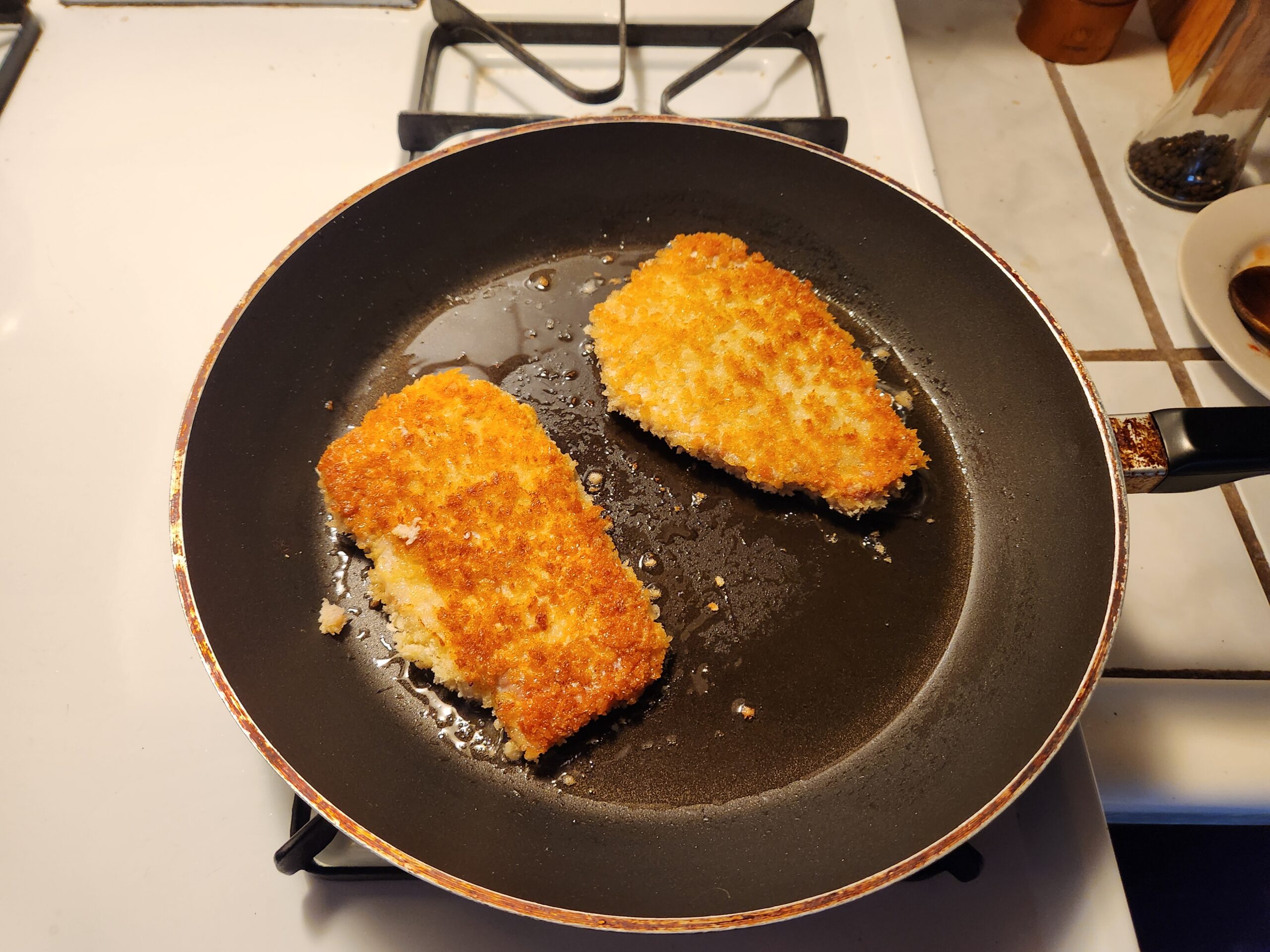 Flour, then shake off the excess. Egg, then panko. If this looks a lot like schnitzel or the chicken for chicken parmesan you are exactly fucking right. If you added parm to the panko all you would need would be a red sauce.