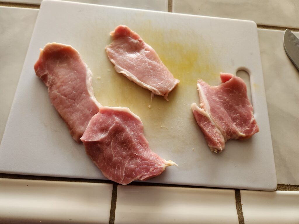 These pork chops are definitely too thick for tonkatsu so we’ll need to butterfly them. Do your best. It may help to freeze the chops for 15 minutes or so in order to have them cut a little cleaner. Or you can just eyeball them.