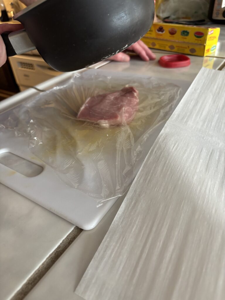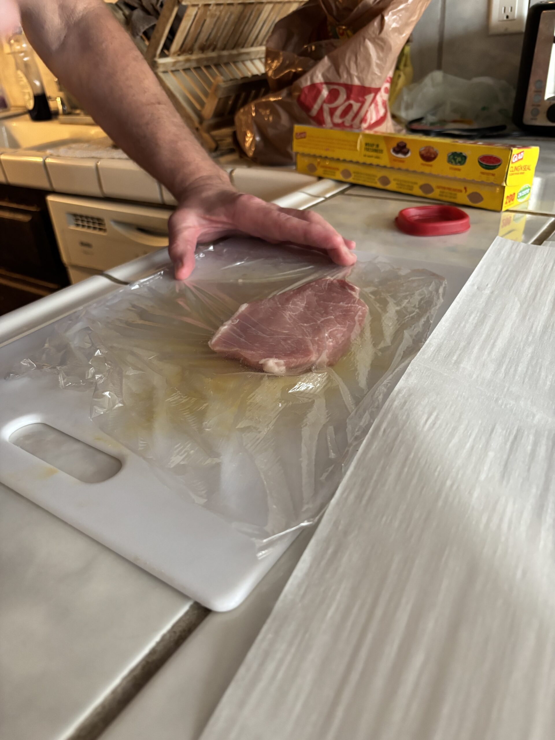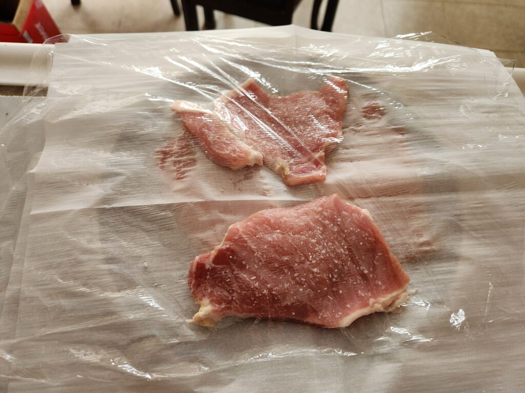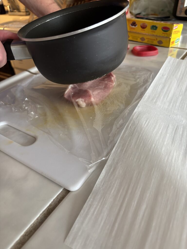 Notice I’ve placed a sheet of plastic wrap over the meat. You can use an actual meat hammer here but I find that it tears the meat. This technique leaves the pieces intact. Just use the edge of a skillet or pot and whack the bejabbers out of the pork.