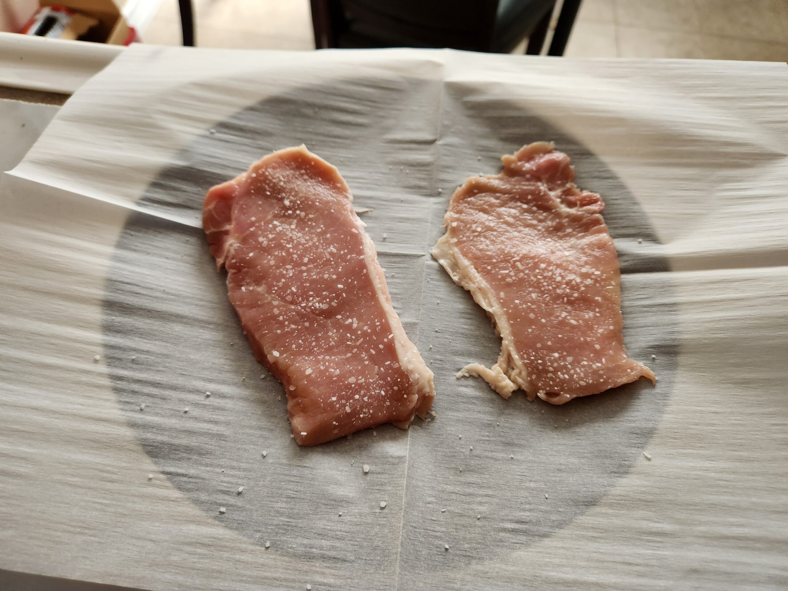 Next, grab a sheet of parchment paper, place the pork slices on top and give them a good salting.