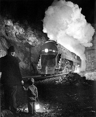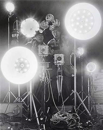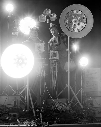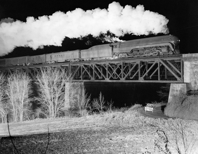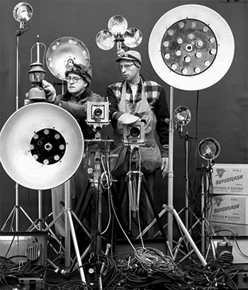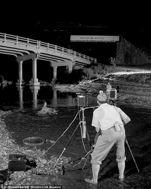 Railroad photographer O. Winston Link and assistant George Thom. Link only photographed trains at night, using rigs containing hundreds of flash bulbs, because he could completely control the light.
