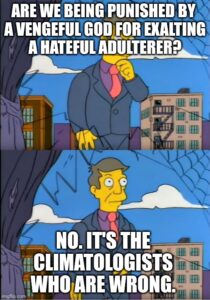 I love how God is literally punishing Texas Christians with Sodom & Gomorrah and Noah’s Ark type stuff and they’re all…