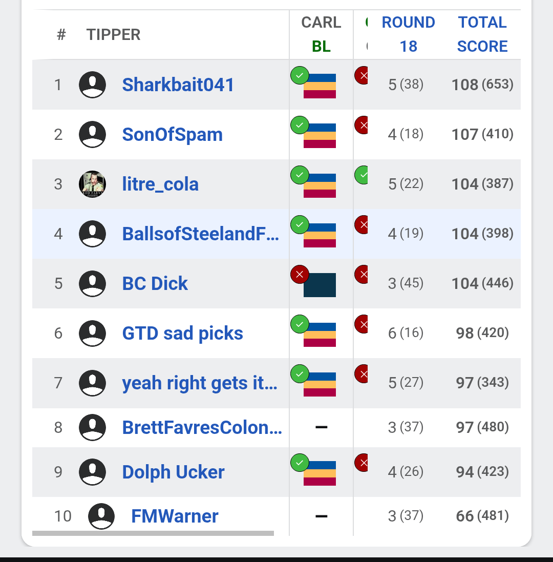 As mentioned above, it was a tough week for the tipping. There is now a three-way tie for third place. The best part is two of those three are related by marriage. THAT’S GOOD FAMILY RIVALRYING!