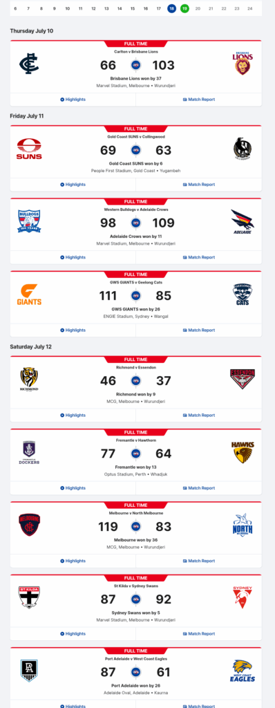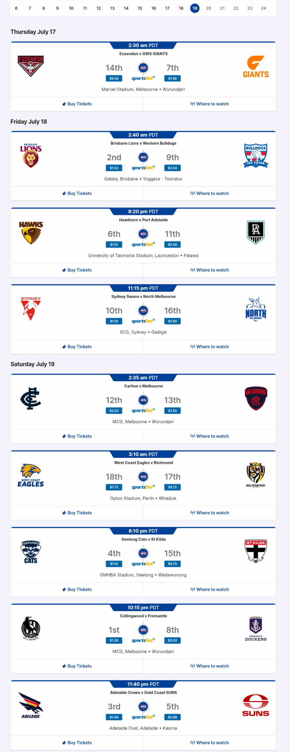 If you are a member of an AFL club or you got a Watch AFL membership, you should be able to watch every AFL and AFLW game, including replays. Game times vary between Australian afternoon and evening, which actually makes it easier for us in North America to watch as the games can be seeing in the evenings on Pacific Time and early mornings on Eastern time.
