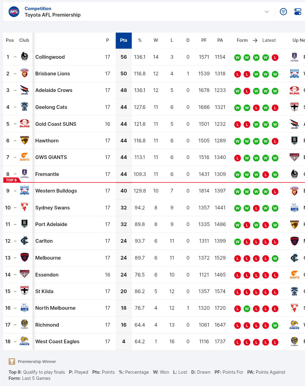 Sydney is the next team up and they are now only 2 games behind thanks to this week’s clutch road win over St. Kilda. Port Adelaide is also only two games behind after beating West Coast.