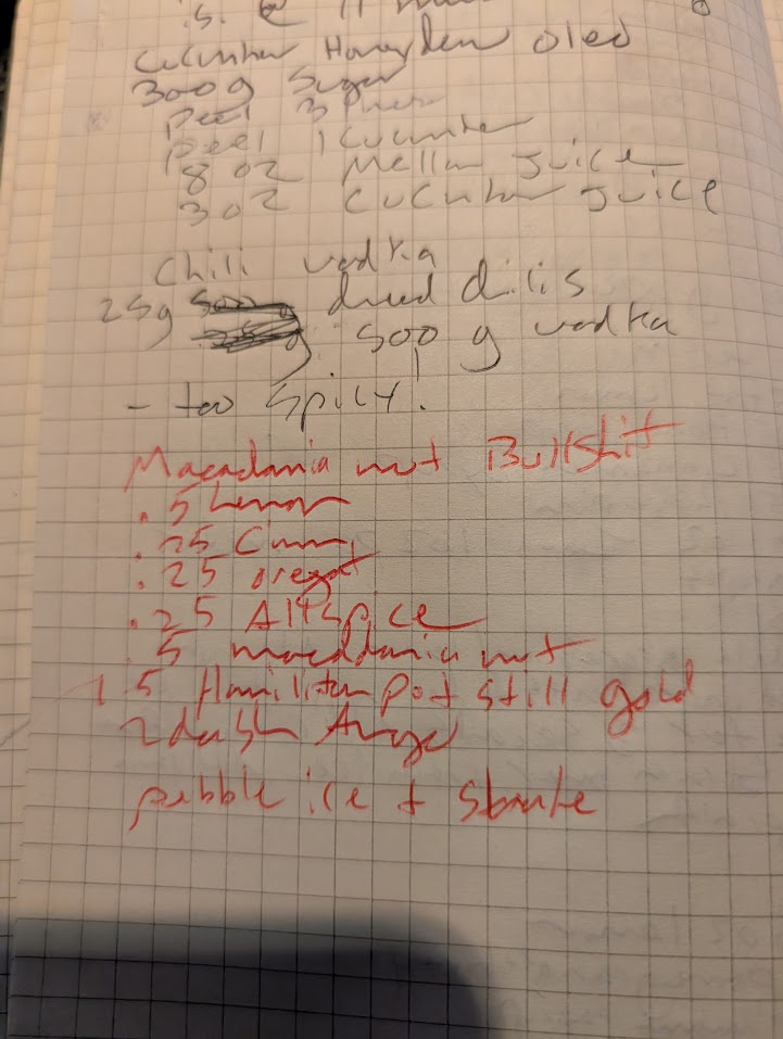 I am very intrigued, howeva, by the scribbles in black above the MacNutBS recipe. Cucumber, honeydew, and chili vodka? Hmmm.