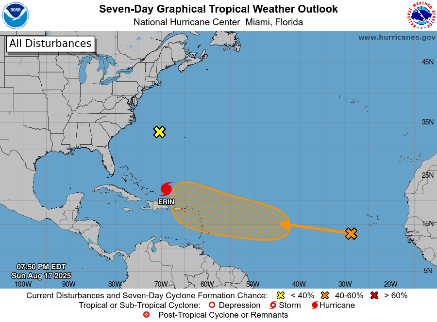 Erin isn’t likely to be a big deal, other than causing some nasty riptides and a few drownings. That orange X following it up, though…that’s probably going to spell the end of the career of whatever hapless chump that is currently running the National Weather Service.