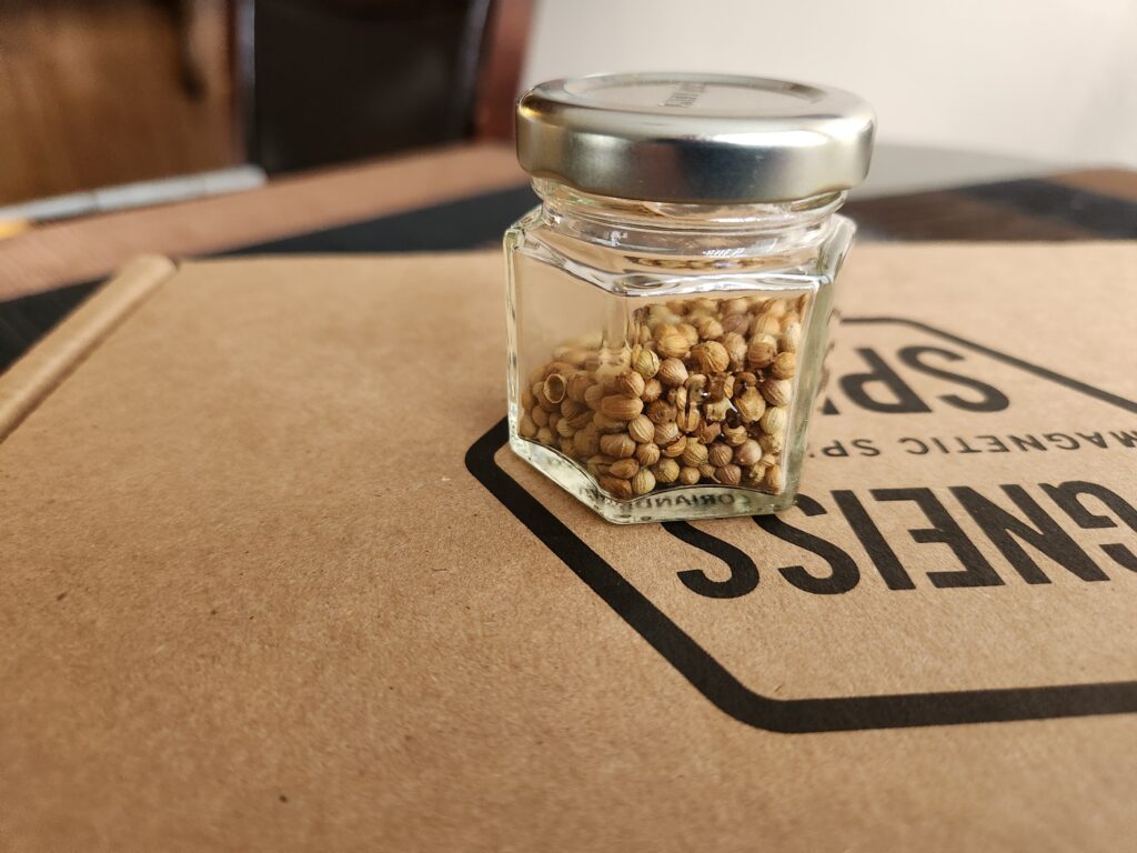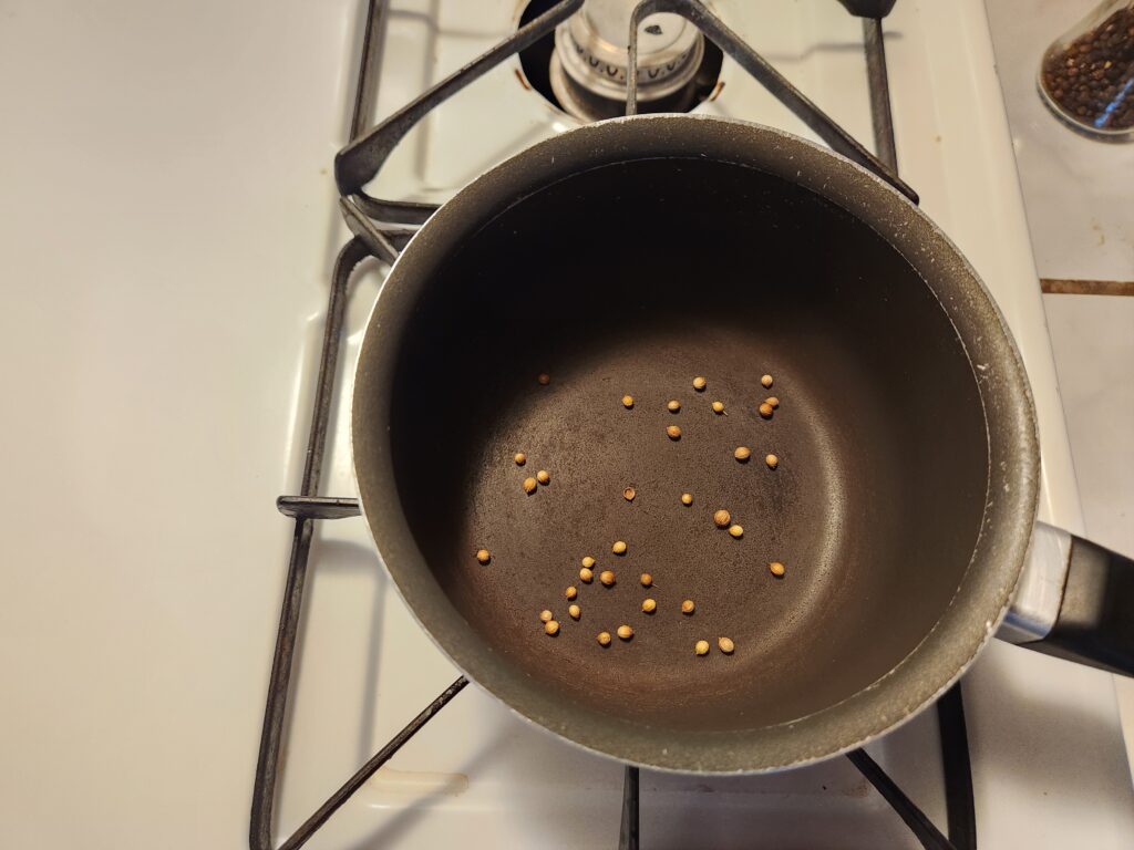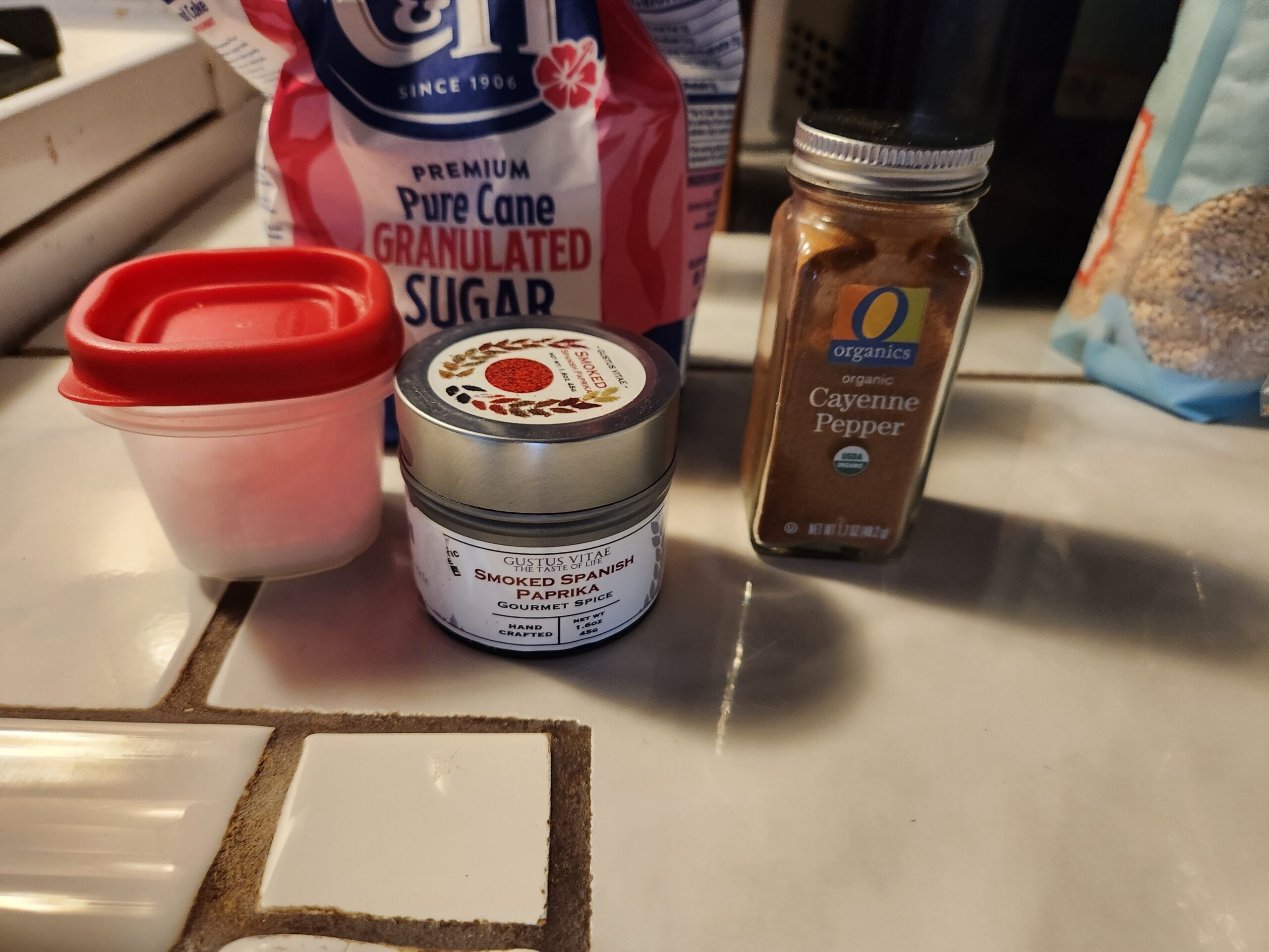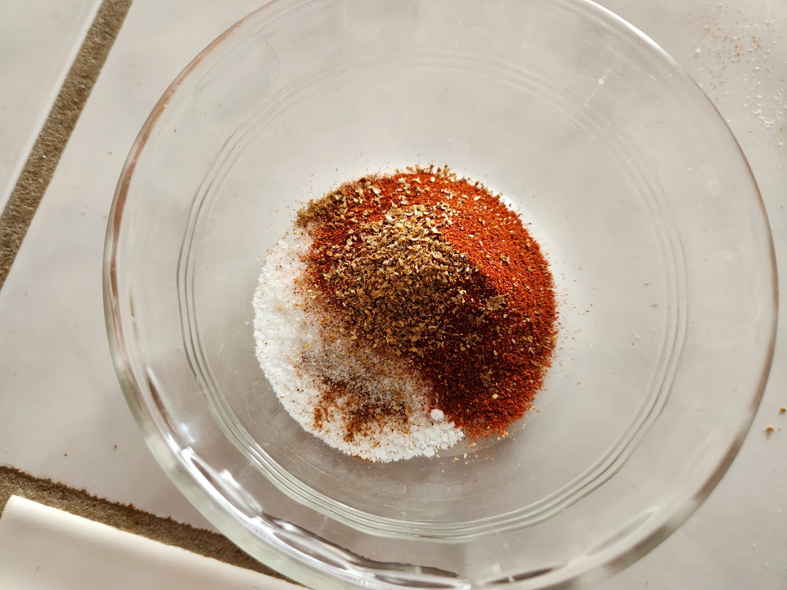 That would be smoked Spanish paprika, cayenne, sugar and salt. Add the ground coriander in the mix and toss them all together in a small bowl.