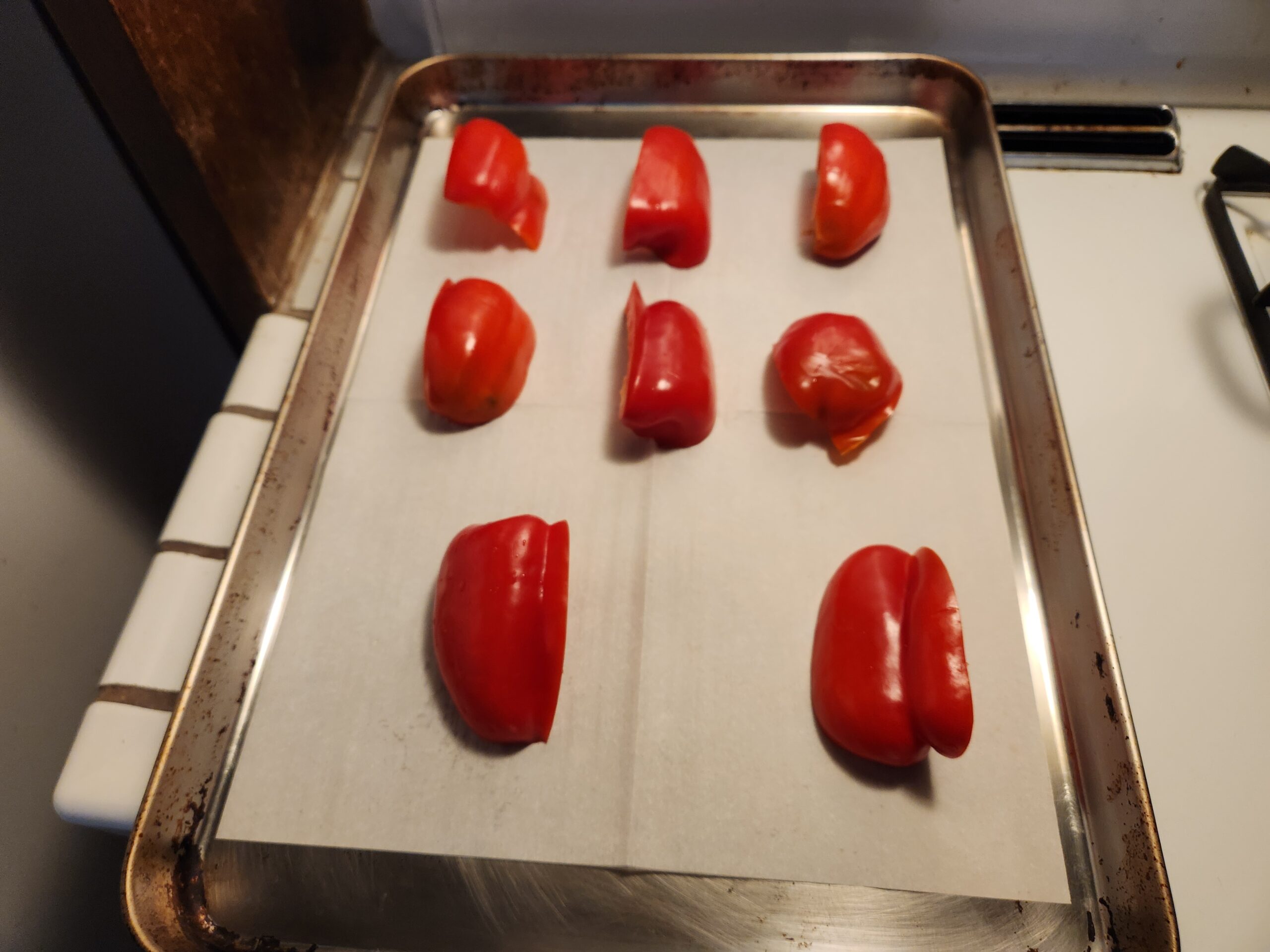 Remove the stems and seeds and cut into quarters. Lay them on a roasting pan that’s got a prophylactic of parchment paper properly prepared.