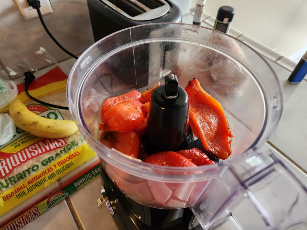 After roasting let the peppers cool in a bowl with some plastic wrap on it to assist with the steaming of the skins. When cool enough to handle, peel off the blistered skins, chop the peppers into a few bits and drop them in the working bowl of your food processor.