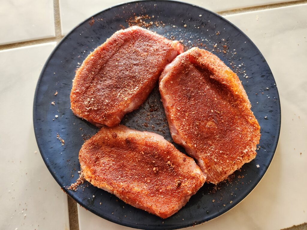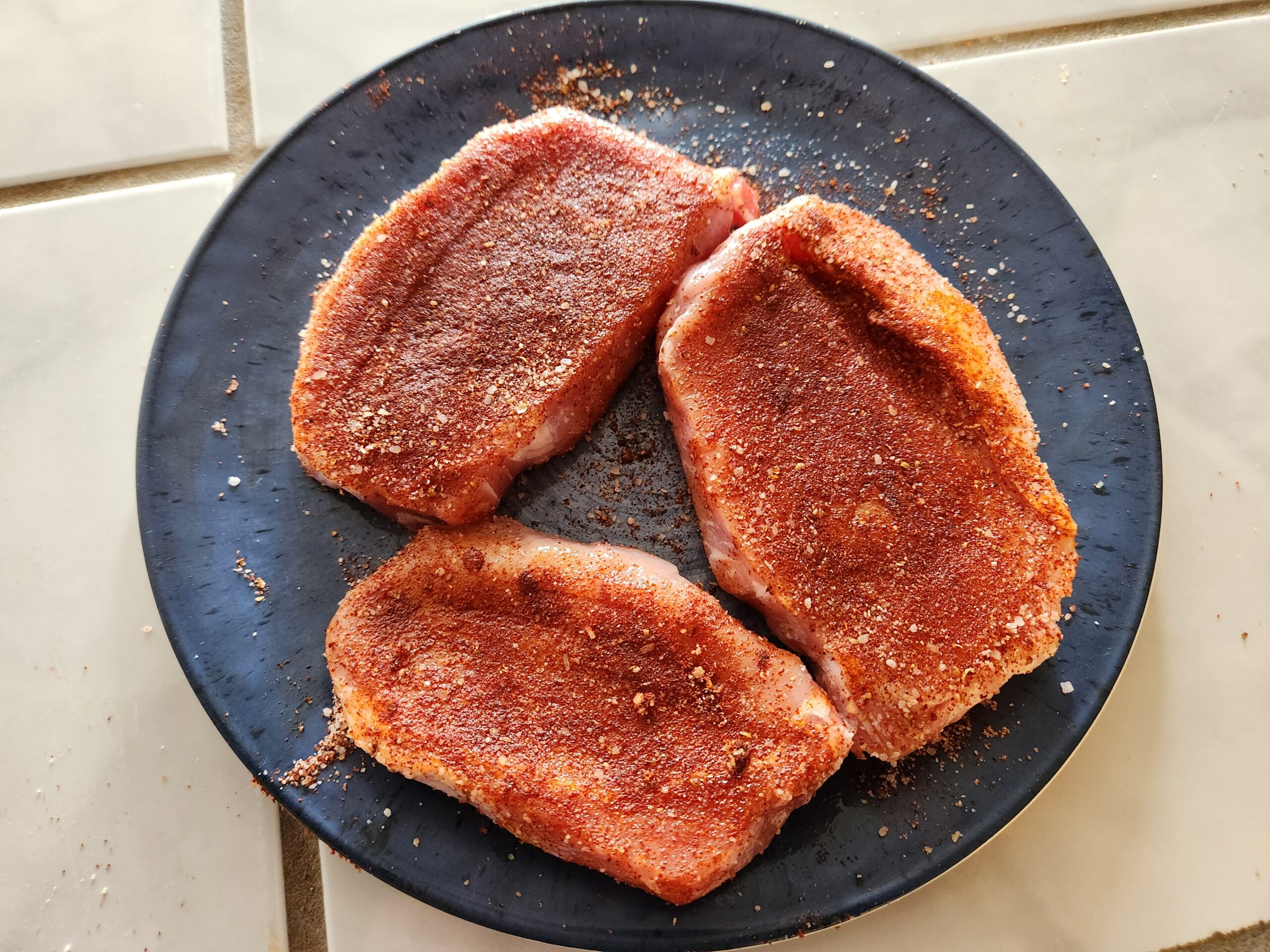 Drizzle a small bit of olive oil on your pork chops then apply the spice rub. Liberally. Do this a day ahead of time for bigass flavor potential.