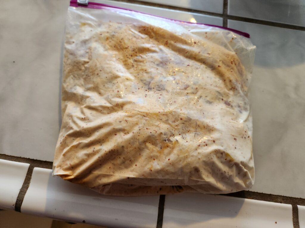 Take all of your marinade ingredients and toss them into a 1 gallon zip top bag. Moosh and squish around until everything is evenly mixed then add in the chicken.