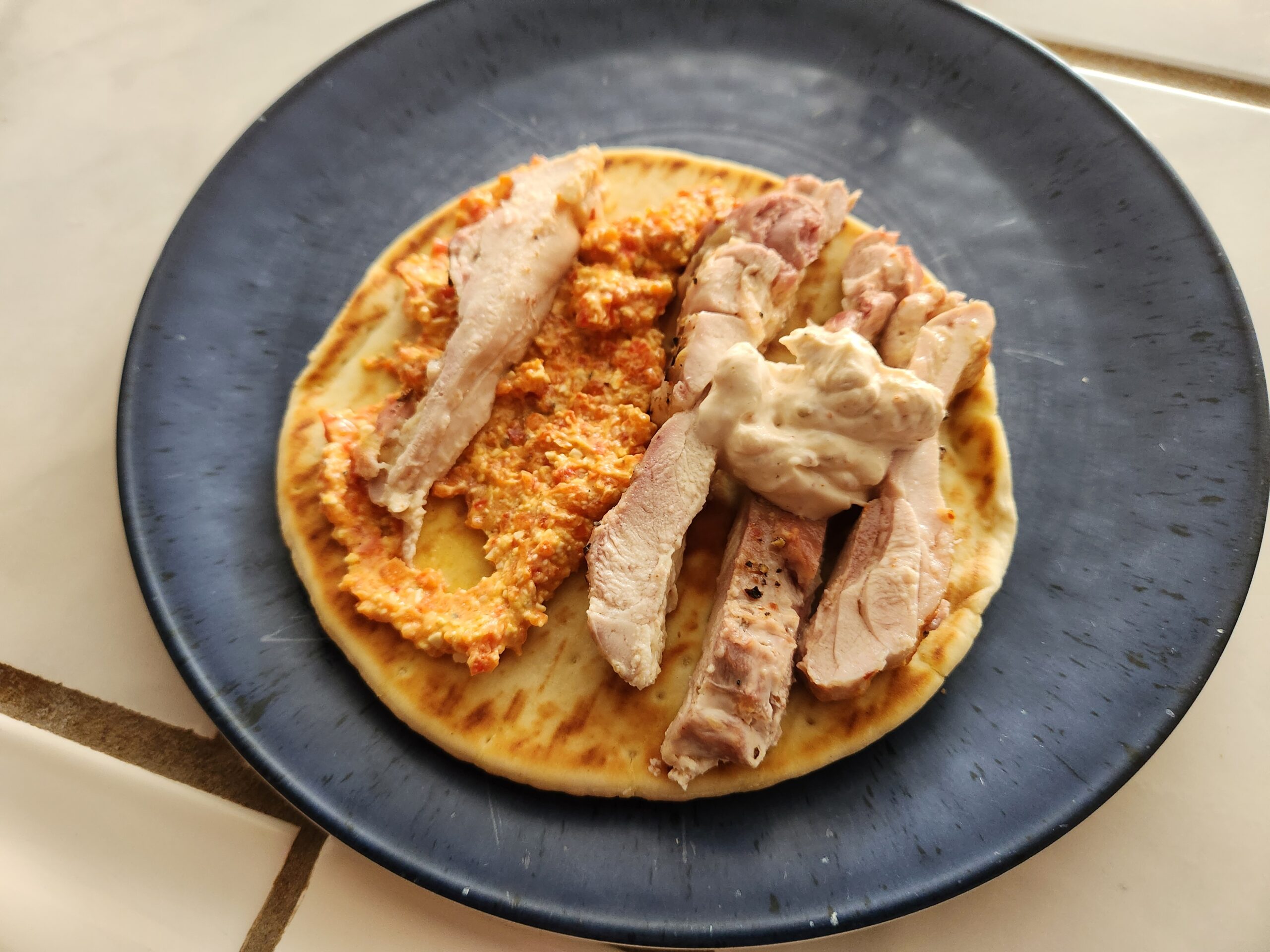 Spread out some of that htipiti – like a cheese spread! – then some chicken and a dollop of the yogurt dip. Like so,