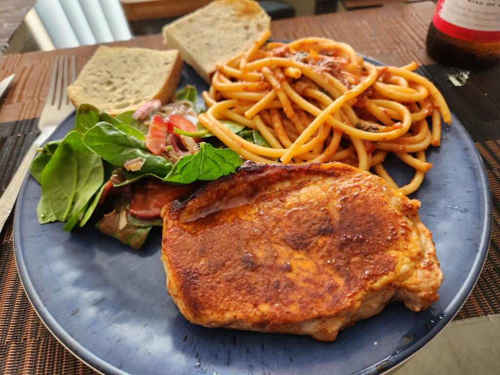 Spinach, strawberry, red onion salad. Olive oil rosemary bread, Real Italian bucatini – thanks again 2Pack – with the leftover sauce from our shakshuka! See? We did use that too! Finally our delicious Spanish paprika rubbed pork chop.