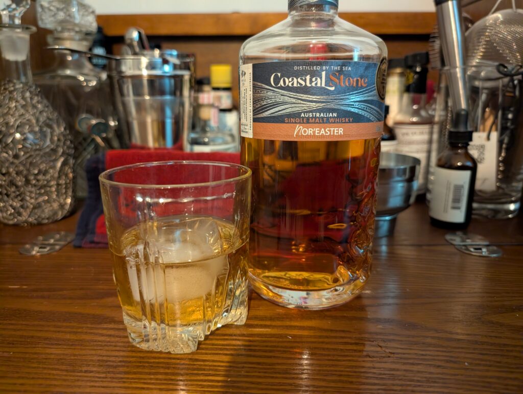 Oh hey, welcome back. After a 3 week travel absence and one week of recovery, I’m back here posting again! The three weeks I spent in Australia were fantastic. This was my second time, and I forgot how much I loved Sydney. Granted this time around it was as an adult and not as a 14 year old, but still. The return trip back to the East coast was predictably rough, especially with two kids in tow. 13 hour flight to LA, plus a 5 hour layover, plus another 6 hour flight home made for a rough few days, hence the need for the recovery week. Of course I was able to bring back some awesome things. Vegemite of course, a Great Northern Brewing Company pint glass that fell into my suitcase somehow, some Tim Tams, and of course some booze! Mrs. Sharkbait took home some alcoholic ginger beer, which was excellent. That needs to become a thing here. I’m not sure why it isn’t already. I brought home some whisky! Specifically, the Coastal Stone Nor’easter single malt whisky. I sampled some before I left at the store and knew that is what I wanted to bring back. So, in lieu of an actual cocktail this week, we’re doing a review of the whisky instead!