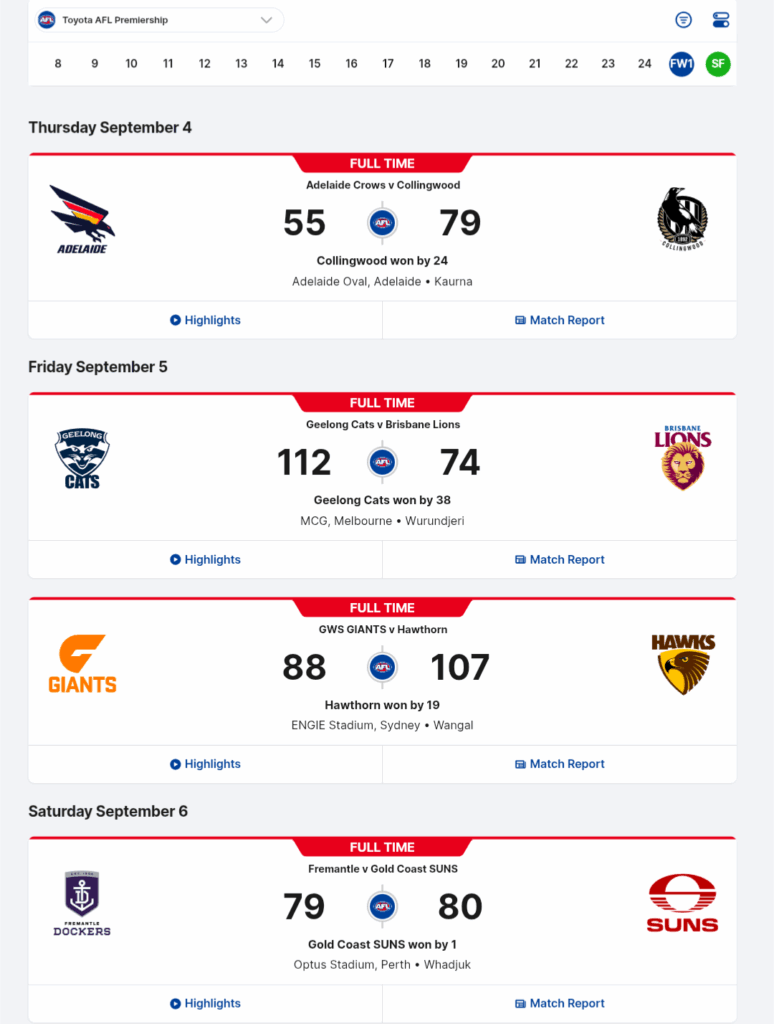 Collingwood turned back the clock and looked like the Collingwood that started the season on a roll. They beat Adelaide in Adelaide and now get a bye into the Preliminary Final. The other bye goes to the Geelong Cats as they beat the Brisbane Lions convincingly at the MCG. Next week, Adelaide hosts Hawthorn while Brisbane hosts Gold Coast in the first ever Finals Q Clash!