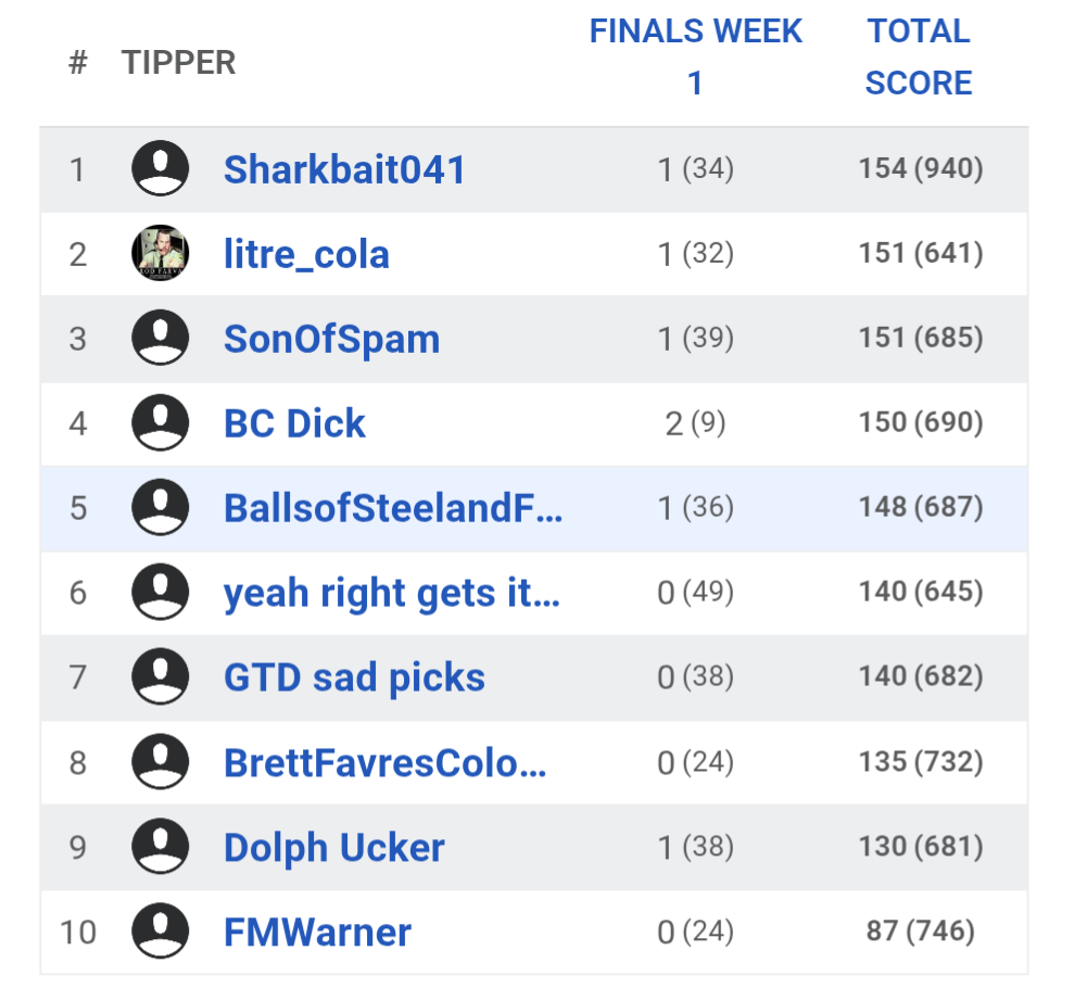 The Tipping Pool is down to the last few games. There are five games left and Sharky has a 3 game lead. Remember that we go all the way until the Grand Final, so it’s not over yet!