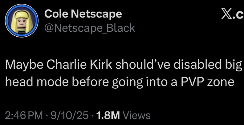 I saw it suggested that it’s a surprise that Ben Shapiro wasn’t targeted first, but that would have been a much tougher shot. Ben Shapiro is 5’6″, tops. Charlie Kirk was 6’5″ and had a face the size of a manhole cover.