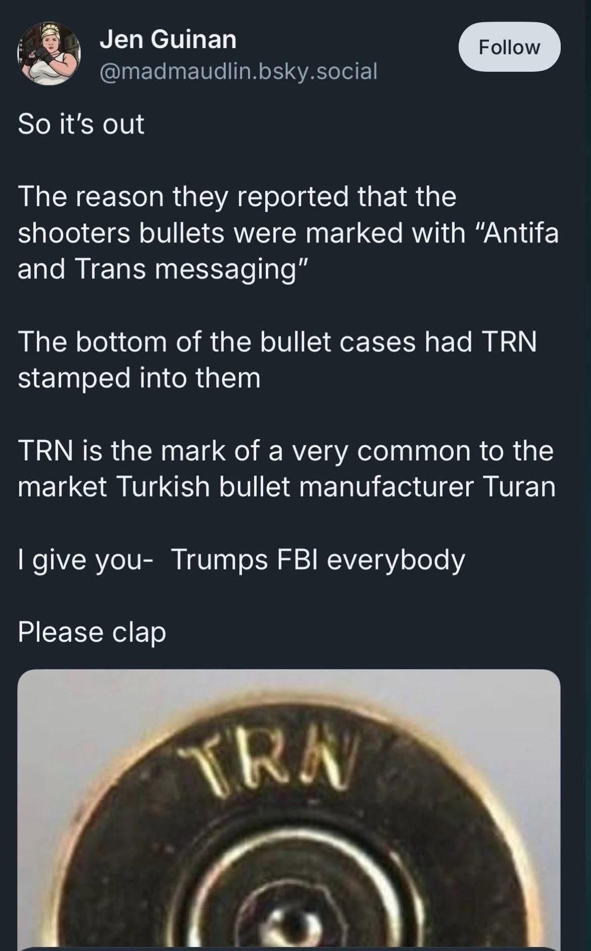 & nobody knows anything for sure yet, but it’s increasingly looking like he wasn’t trans, or a liberal SJW, or a marxist, but just a kid who was always online and had his brain melted by guys like… Charlie Kirk.