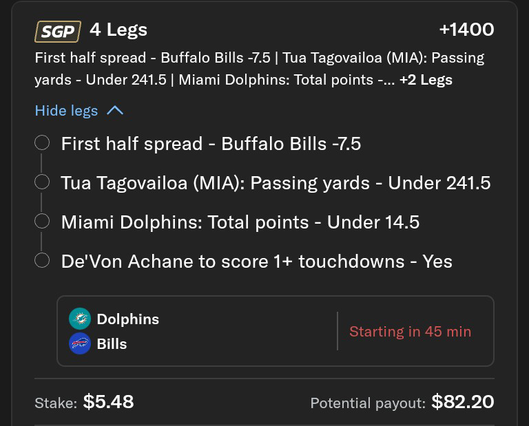 I also decided to be smart and not parlay stupid and took Buffalo at -12.5. My greed for $4.55 has doomed us all.