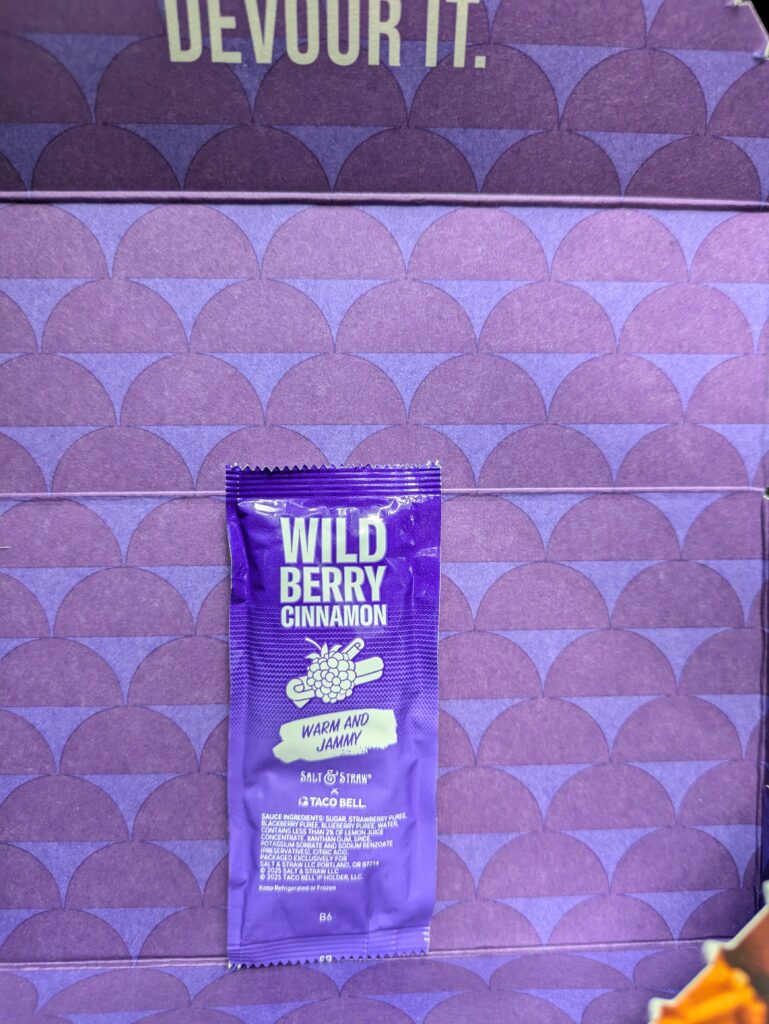 As you can probably start to tell, the packaging keeps getting smaller. The wrapper is barely the size of the picture of the taco on the outer packaging. Keen-eyed readers will note that there is a sauce package underneath the gold packaging. It turned out to be a packet of Wild Berry Cinnamon sauce!