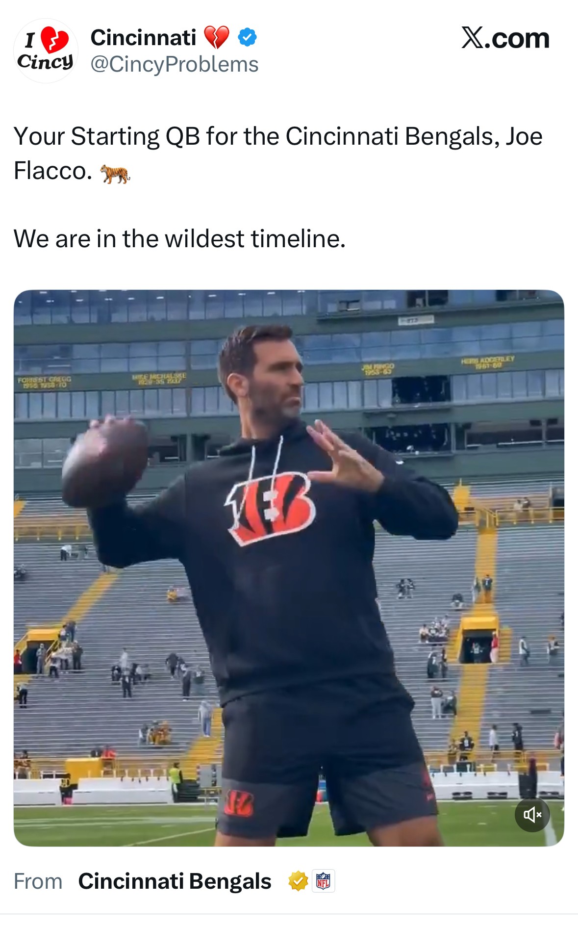 Today’s Saddest Fact of the Day: When Joe Flacco takes his first snap, for the first time in Franchise History, the Bengals will finally have a QB who has won a Super Bowl.