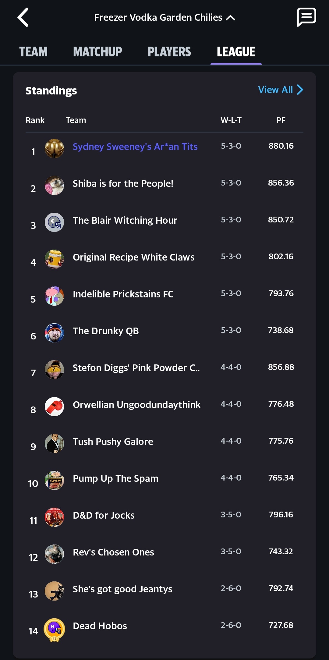 There is someone with more points for, 938, but they are the person with the second most against and sit at 4-4. I’m 3-5 in that league.