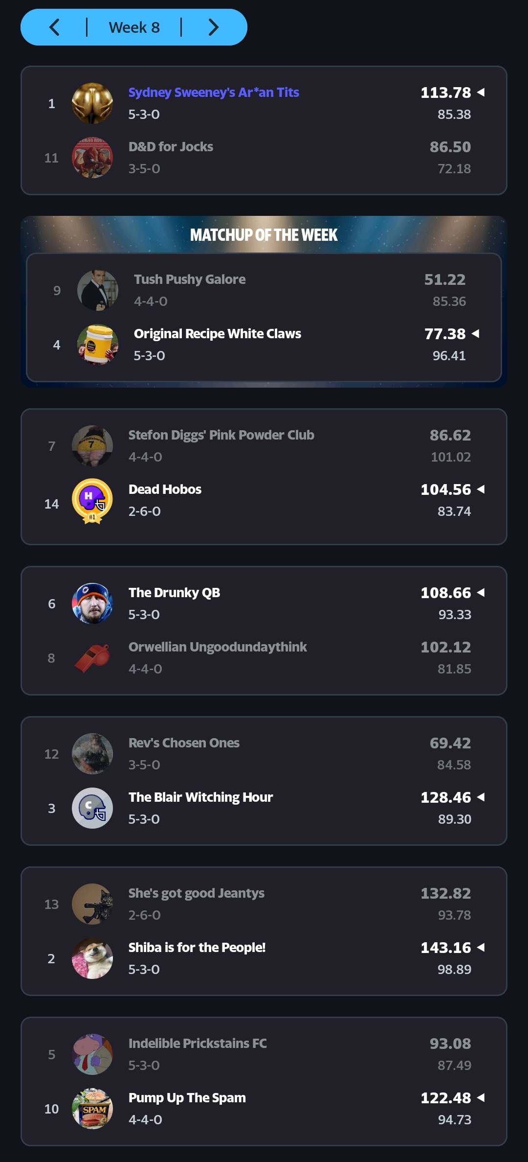 Boy, look at all that parity in this league. Six teams tied at 5-3, four teams at 4-4…and then there’s the Relegation Zone. D&D for Jocks, Rev’s Chosen Ones, She’s got good Jeantys and Dead Hobos should get ready to fill out those change of address cards and get ready to move to Lowratio League.