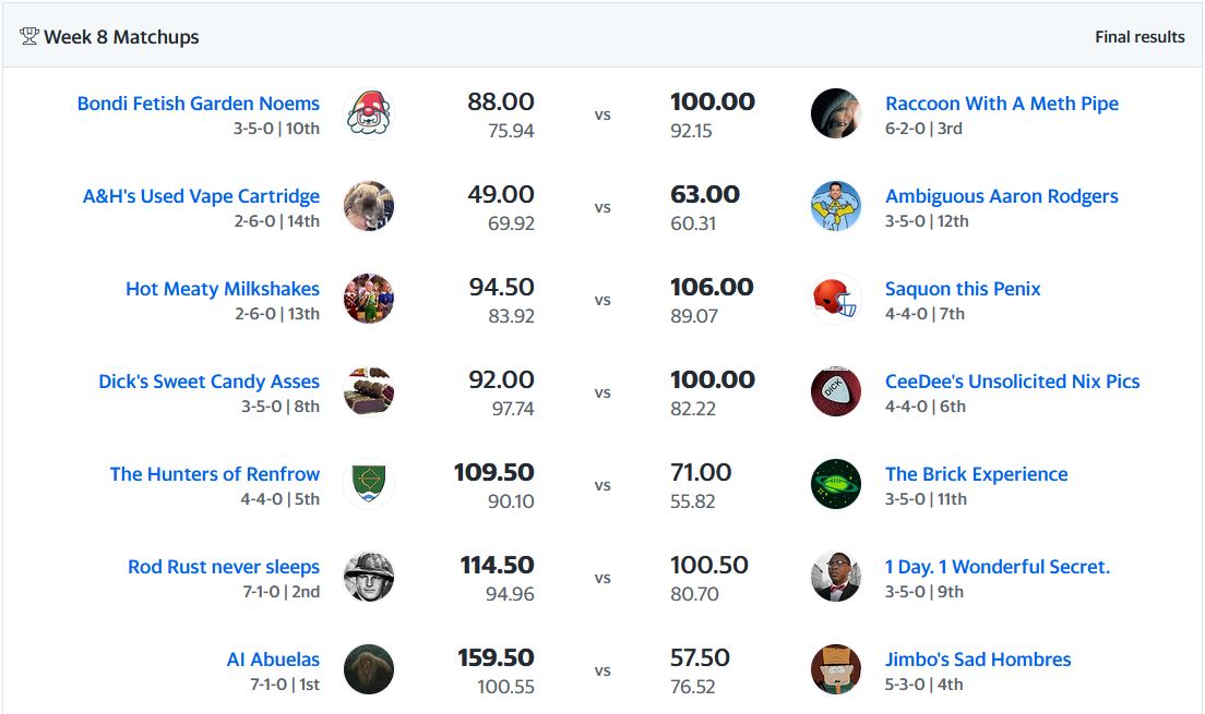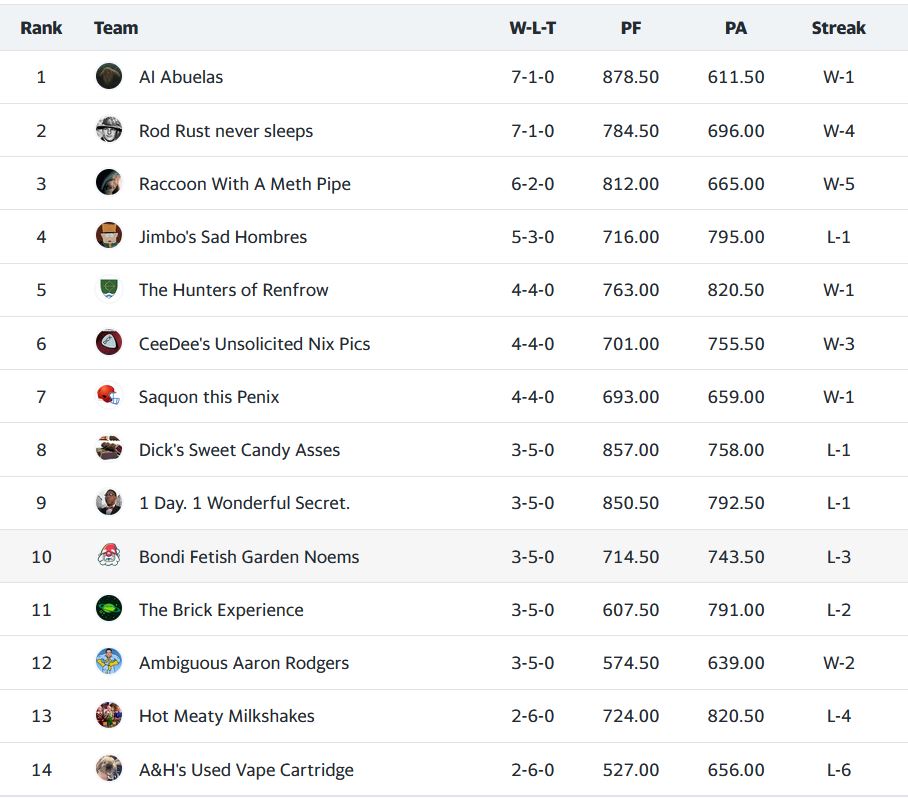 So, what’s changed since last week? To quote our resident water horse pill aficionado, “The square root of fuck-all.” AI Abuelas and Rod Rust never sleeps still hold the two automatic promotion spots, though that dominance is being threatened by Raccoon With A Meth Pipe only a game back and riding a five game win streak. Jimbo’s Sad Hombres remains in the fourth spot and still well within striking distance of the top two spots. Three teams, The Hunters of Renfrow, Cee Dee’s Unsolicited Nix Pics, and Saquon this Penix are in a scrum for the last two playoff spots. The next four teams at 3-5 aren’t eliminated yet, but its not looking too good for their playoff prospects. That leaves Hot Meaty Milkshakes and A&H’s Used Vape Cartridge in the standings basement.