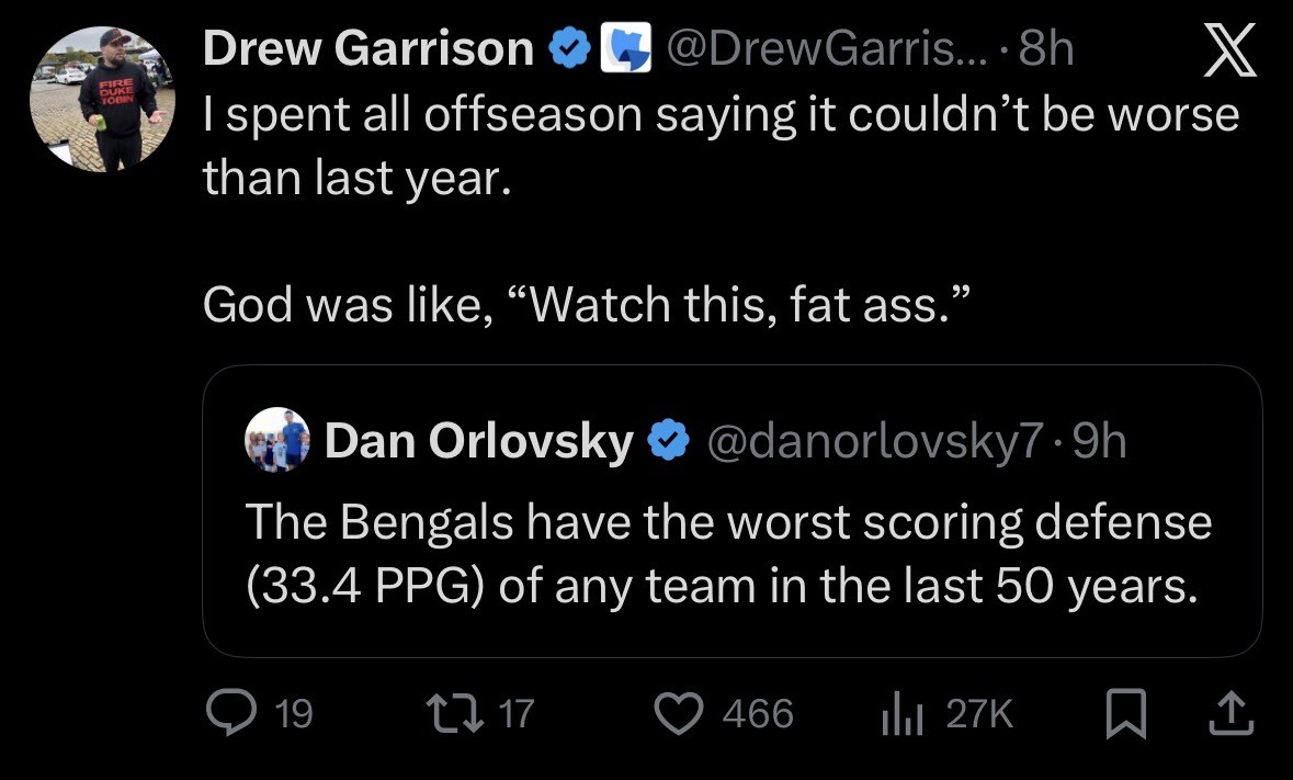 So many words wasted on a guy that ain’t playin. But that’s just the cesspool that we all swim in. Why drag Joe’s carcass out there what with Chase not playing and the season done anyway? Well, because that’s typical Bengals standard operating procedure. Start everyone you have on New England, there’s a bloodbath coming.