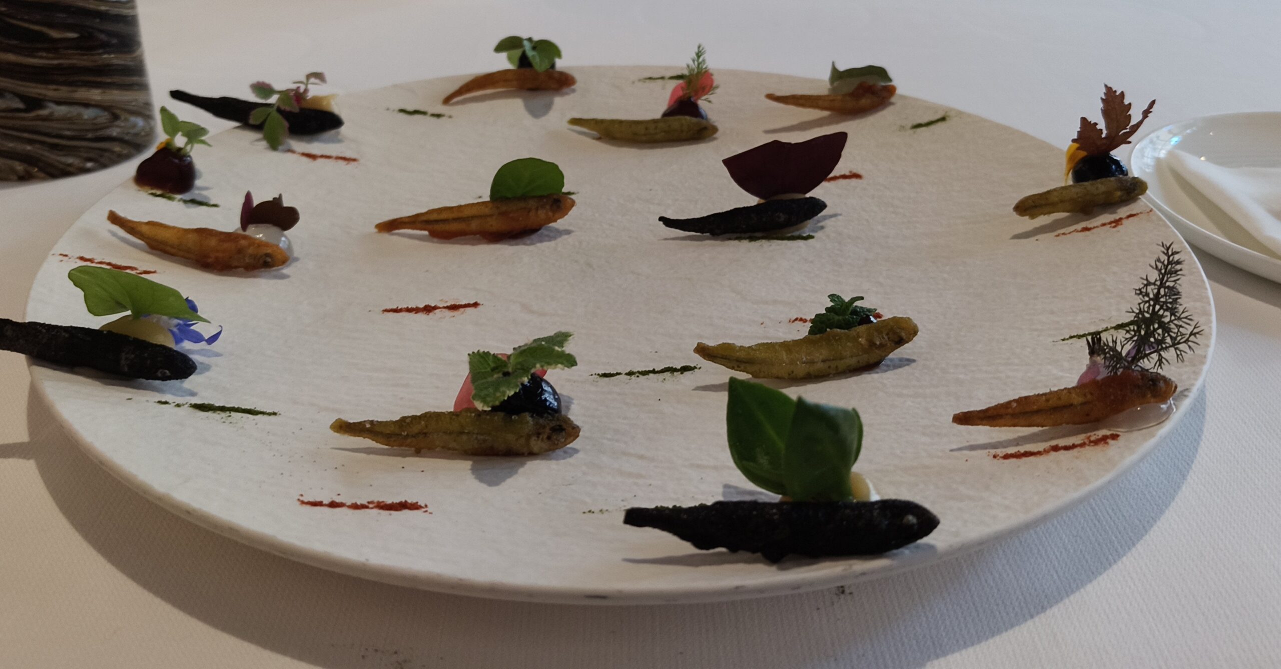 After a 3 hour nap I managed to digest enough to eat the petit fours I took away with me. Here’s a picture of one of the signature dishes, tempura smelt with 4 tempuras and 4 dipping sauces (lemon, ponzu, cuttlefish milk, squid ink) and different veggie garnishes also. Everything is local so even the veggies have some sea flavor from being grown in the lagoon (probably on Sant’Erasmo)