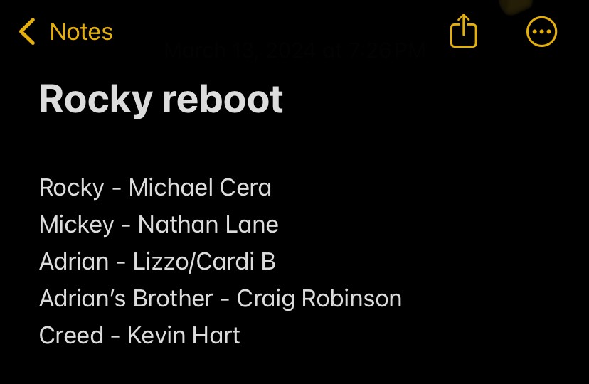 Looking through my phone lists and it seems in March 2024 I thought through a Rocky reboot starring Michael Cera as Rocky and even put together a cast list.