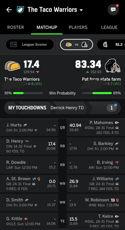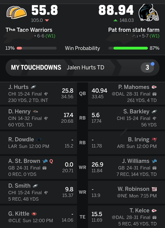 Even worse now, this is going to set me back in tie breakers, so if this loss goes through, and all of the other projected matchups go as predicted, it’ll create a 4 way tie for the last playoff spot, meaning not only do i have to win next week, I have to make up the tie breaker as well.