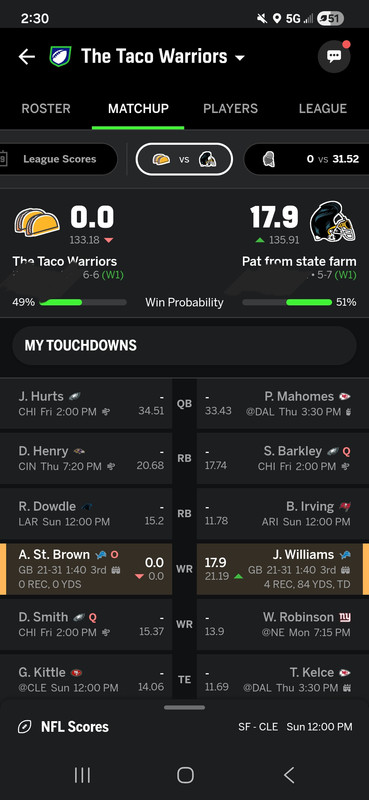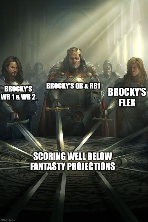 Fuck, I meant to swap out Jeudy for Shaheed. Shadoobie couldn’t find his ass with both hands and a flashlight, there’s no way he can find a receiver. Oh well, I’m getting relegated anyway, it really doesn’t matter.