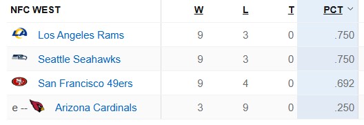 with the other two teams currently holding the tiebreaker over the Seahawks by virtue of leading the head-to-head meetings. The Week 1 loss to the Niners was Sam Darnold’s fault, and the Week 11 loss to the Rams was also Sam Darnold’s fault. So I guess what I’m saying is
