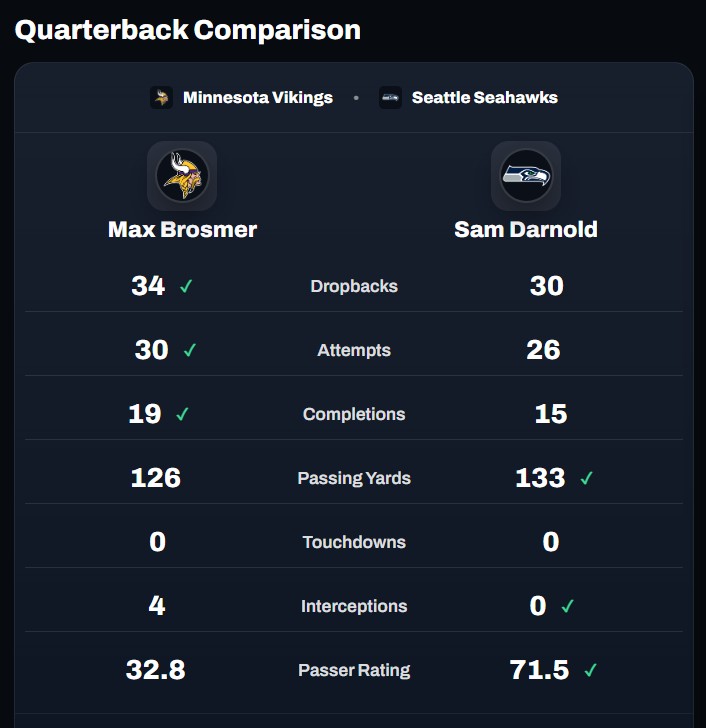 But it’s not like Sam Darnold was any better. His stat line was, as shown earlier, about the same – 14 of 26 for 128 yards, with two fumbles. Zach Charbonnet got the only offensive major, late in the 4th when the Vikings had long-since given up, and the average length of Jason Myers’ field goals was 46 yards. At one point, this was a more accurate reflection of the score than what the scoreboard actually said: